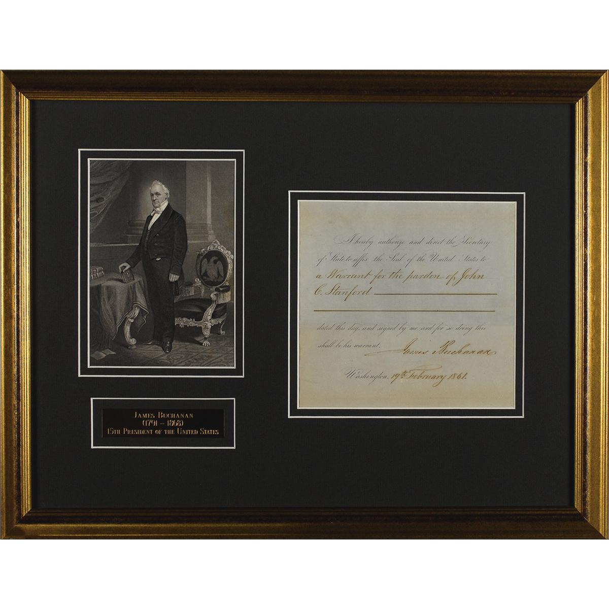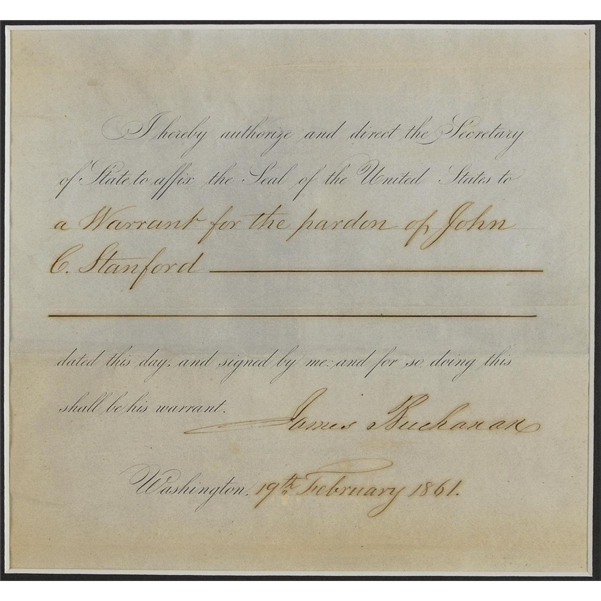 Partly-printed DS as president, one page, 7.5 x 7.25, February 19, 1861. Buchanan orders the Secretary of State to affix the seal of the United States to “a Warrant for the pardon of John C. Stanford.” Archivally double matted and framed with a portrait of Buchanan and a name plaque to an overall size of 21.5 x 16.5. In very good condition, with several horizontal folds and creases, scattered toning, including over signature, and some light spreading of ink to signature.