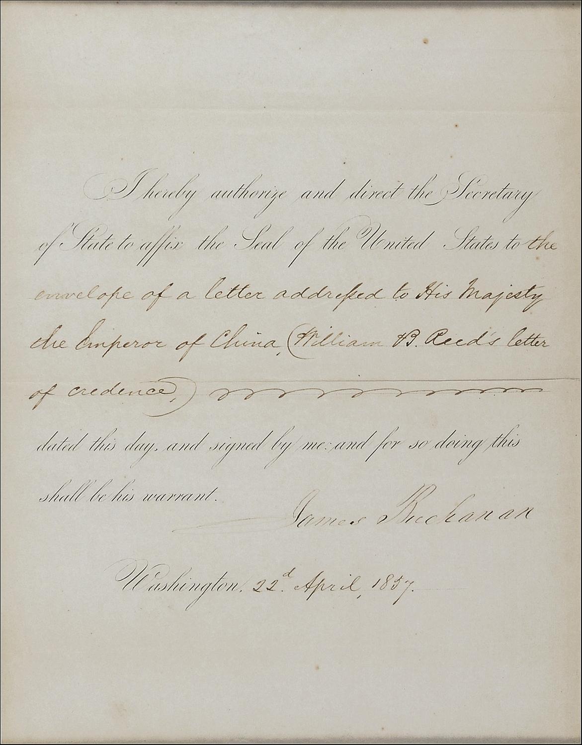Partly-printed DS as president, one page, 7 x 9, April 22, 1857. President Buchanan orders the Secretary of State “to affix the Seal of the United States to the envelope of a letter addressed to His Majesty the Emperor of China (William B. Reed’s letter of credence).” Signed at the conclusion by Buchanan. Cloth matted and framed to an overall size of 12.75 x 14.75. Scattered creases, a couple lightly affecting signature, as well as some scattered light toning, otherwise fine condition. An important document as the letter notified the Emperor of China of Reed’s appointment as ambassador. At this time, the Second Opium War was being fought by China and Britain and France. Reed would be stepping into a very volatile situation, which would eventually draw the US Navy into the conflict.