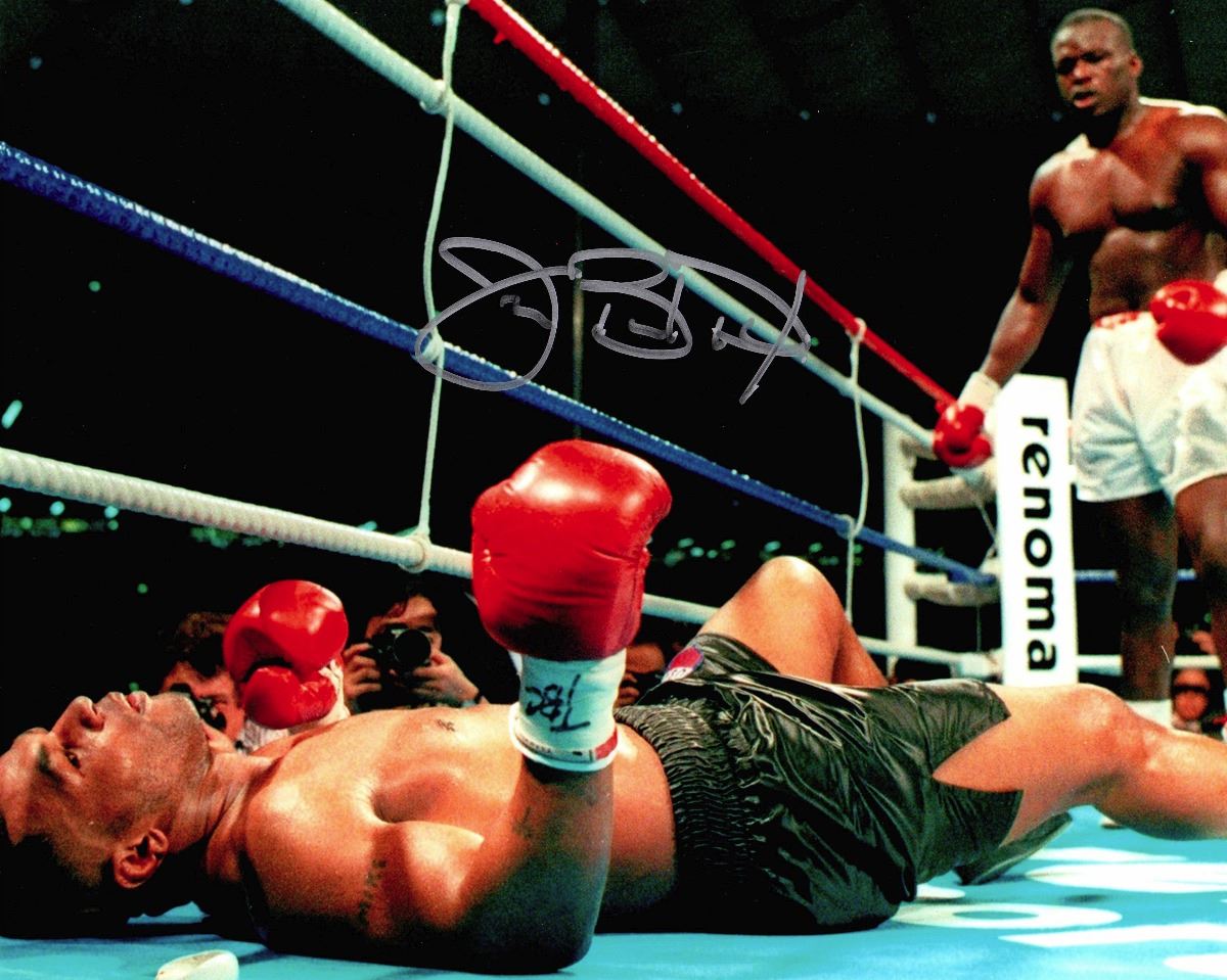 James Buster Douglas signed Boxing match with Mike Tyson on ground 8x10 photo. Image is from Buster Douglas' historic 42-1 underdog upset against Mike Tyson. Item comes with a Schwartz Sports Memorabilia tamper-proof numbered hologram and Certificate of Authenticity which can be verified online.
