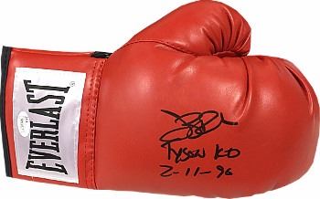 James "Buster" Douglas is a former undisputed world heavyweight boxing champion who scored a stunning upset when he knocked out previously undefeated champion Mike Tyson on February 11, 1990 in Tokyo, Japan. At the time, Tyson was considered to be the best boxer in the world and one of the most feared heavyweight champions in history due to his utter domination of the division. Douglas held the title for eight months and two weeks. James "Buster" Douglas has hand signed this Everlast Boxing Glove with TYSON KO 2-11-90 inscription. JSA Hologram and Certificate of Authenticity.