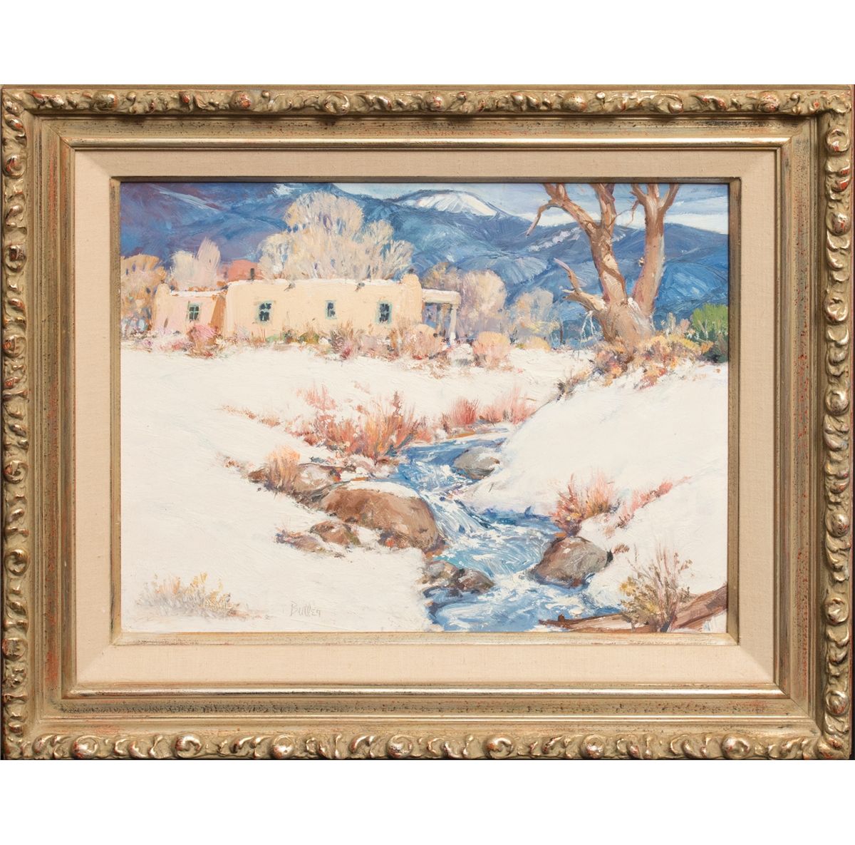 James Butler (1925 - ). Tesuque Winter. 16" x 20" oil on board. Signed lower left: Butler. Verso: titled.