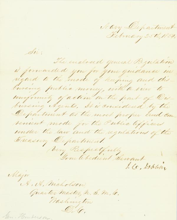 JAMES C. DOBBIN. (1814-1857). Dobbin served as Franklin Pierce’s Secretary of the Navy. During his tenure, he instated numerous reforms, including the forced retirement of many old andineffective officers. Letter Signed, “J.C. Dobbin.” One page, 8” x 9 ¾”. Navy Department. February25, 1854. Dobbins “Sir, The enclosed general Regulation is forwarded you for you guidance inregard to the mode of keeping and disbursing public money, with a view to uniformity of action onthe part of Disbursing Agents. It is considered by the department as the most proper and convenientmode for the Public Officers under the law and the regulations of the Treasury Department. Very Respectfully Your Obedient Servant J.C. Dobbin. Excellent.