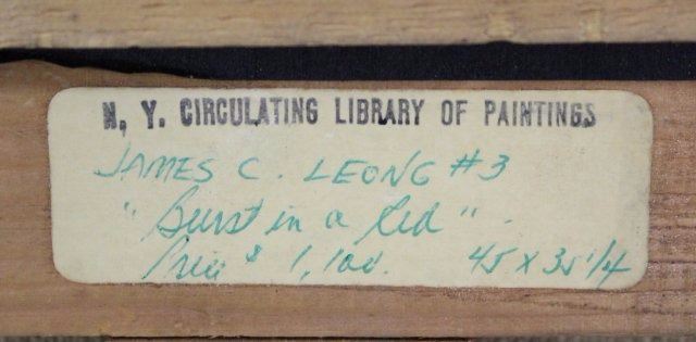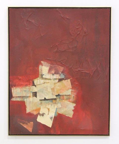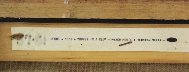 Mixed media oil and collage abstract. Signed and dated 1961 lower left. James C. Leong (born 1929). Approx. 46" H x 36" W framed. From the collection of Mr. Sydney Edelstein.
