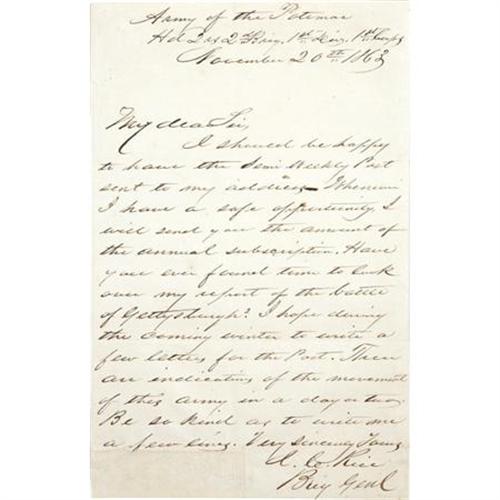<B>James C. Rice War Date Autograph Letter Signed</B></I> "<I>J. C. Rice Brig Genl</B></I>", one page, 5" x 8", "<I>Army of the Potomac Hd. Qrs. 2nd Brig. 1st Div. 1st Corps</B></I>", November 20, 1863 concerning his official report on the Battle of Gettysburg. He writes, in full: "<I>I should be happy to have the Semi Weekly Post sent to my address. Whenever I have a safe opportunity, I will send you the amount of the annual subscription. Have you ever found time to look over my report of the battle of Gettysburg? I hope during the coming winter to write a dew letters for the Post. There indications of the movement of this army in a day or two. Be so kind as to write me a few lines.</B></I>" At Gettysburg, then Colonel Rice took command of the Union forces at Little Round Top when General Vincent was mortally wounded, commanding only 1000 men in a heroic defense of the position, helping turn the tide in favor of the Union. He was promoted to brigadier general for his actions there. Loss at bottom left repaired, usual folds, else fine. Scarce in war-date content.<BR><BR><b>Shipping:</b> Flat Material, Small (<a target="_blank" href="http://www.heritageauctions.com/common/shipping.php">view shipping information</a>)