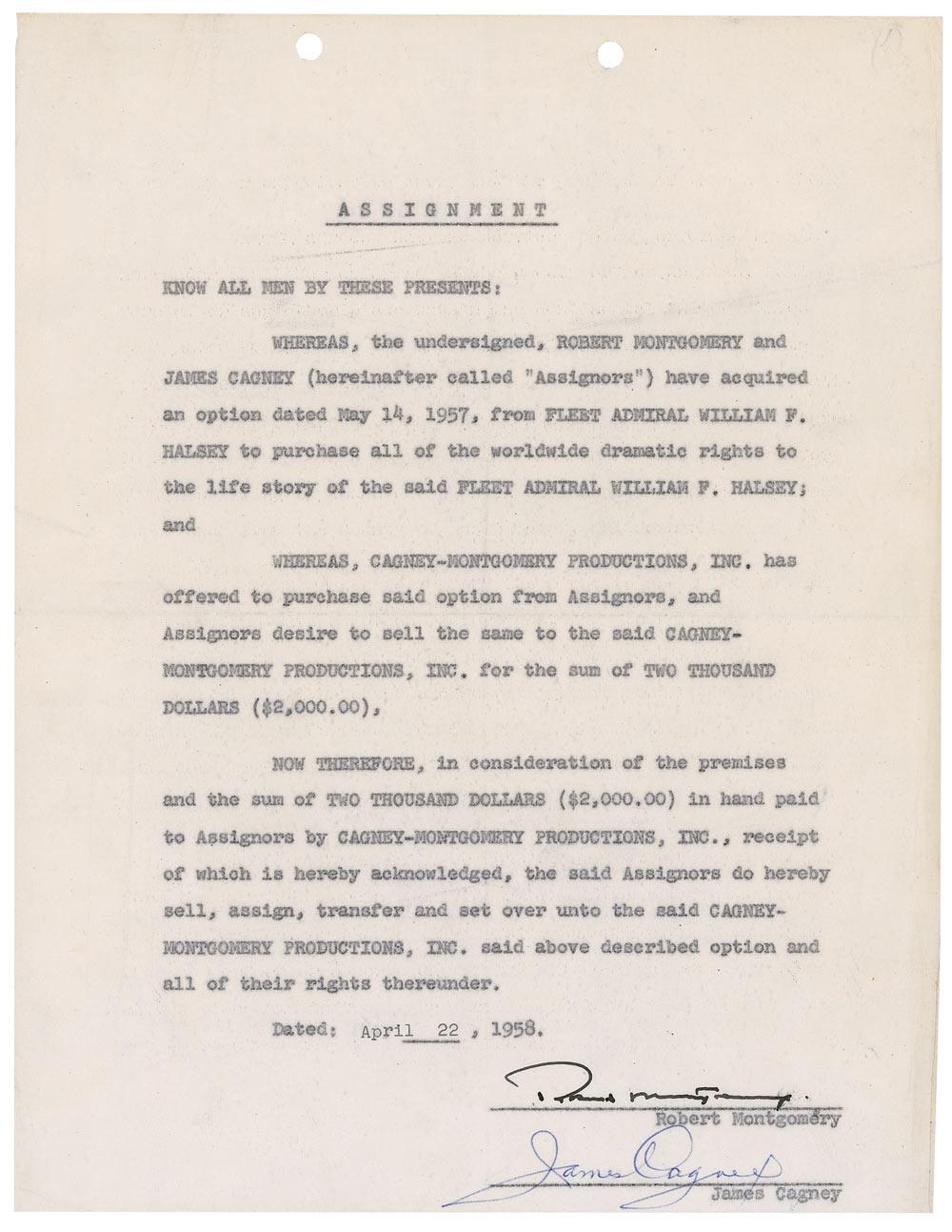 DS, one onionskin page, 8.5 x 11, April 22, 1958. Cagney and Robert Montgomery agree “to purchase all of the worldwide dramatic rights to the life story of the said Fleet Admiral William F. Halsey,” with Cagney-Montgomery Productions purchasing the option for the sum of $2000. Signed at the conclusion by Cagney and Robert Montgomery. In fine condition, with two punch holes to top edge, and some mild edge toning. Two years later Cagney would star as Halsey in the bio-pic The Gallant Hours, directed by Montgomery. It would be the only film released by their production company.