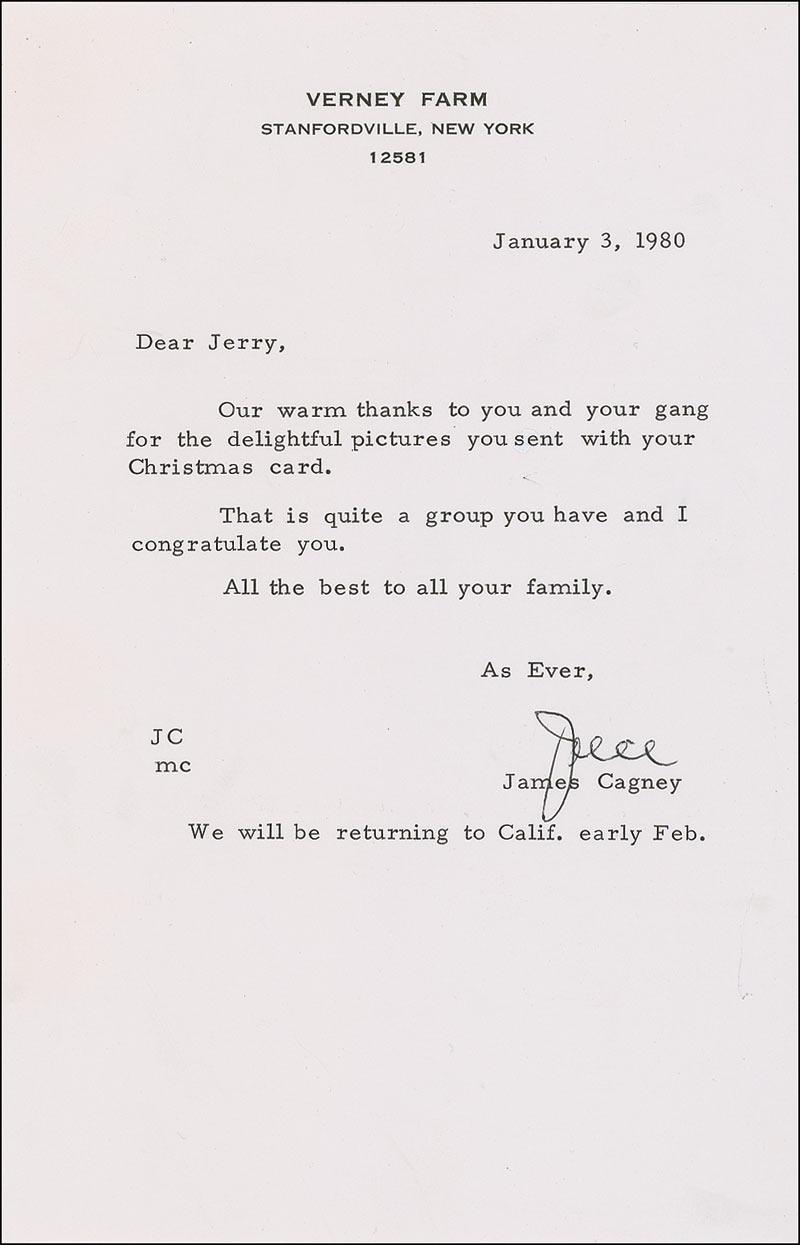 TLS signed “Jim,” one page, 5.5 x 8.5, Verney Farm letterhead, January 3, 1980. Letter to Jerry Lewis. In part: “Our warm thanks to you and your gang for the delightful pictures you sent with your Christmas card. That is quite a group you have and I congratulate you.” In fine condition. Accompanied by the original transmittal envelope.
