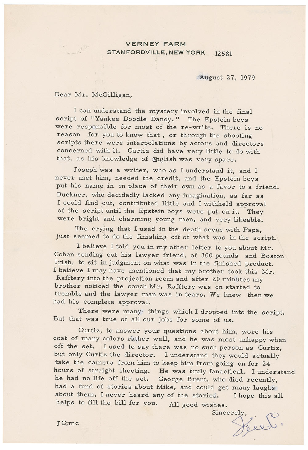 TLS signed “Jim C.,” one page, 7.25 x 10.5, Verney Farm letterhead, August 27, 1979. Cagney writes an admirer. In part: “I can understand the mystery involved in the final script of ‘Yankee Doodle Dandy.’ The Epstein boys were responsible for most of the re-write. There is no reason for you to know that, or through the shooting scripts there were interpolations by actors and directors concerned with it. Curtiz did have very little to do with that, as his knowledge of English was very spare...and the Epstein boys put his name in in place of their own as a favor to a friend…The crying that I used in the death scene with Papa, just seemed to do the finishing off of what was in the script. I believe I told you in my other letter to you about Mr. Cohan sending out his lawyer friend, of 300 pounds and Boston Irish, to sit in judgment on what was in the finished product…after 20 minutes…the lower man was in tears. We knew then we had his complete approval. There were many things which dropped into the script. But that was true of all our jobs for some of us. Curtiz, to answer your questions about him, wore his coat of many colors rather well, and he was most unhappy when off the set. I used to say there was no such person as Curtiz, but only Curtiz the director. I understand they would actually take the camera from him to keep him from going on for 24 hours of straight shooting. He was truly fanatical. I understand he had no life off the set.” In fine condition, with intersecting horizontal and vertical folds. A unique firsthand perspective of Cagney’s Academy Award-winning role, brimming with colorful anecdotes including being placed under the microscope by Cohan’s “lawyer friend, of 300 pounds and Boston Irish,” the contributions by ‘script doctors,’ Julius J. Epstein and Philip G. Epstein, and the intensity of director Michael Curtiz who “wore his coat of many colors rather well, and he was most unhappy when off the set.”