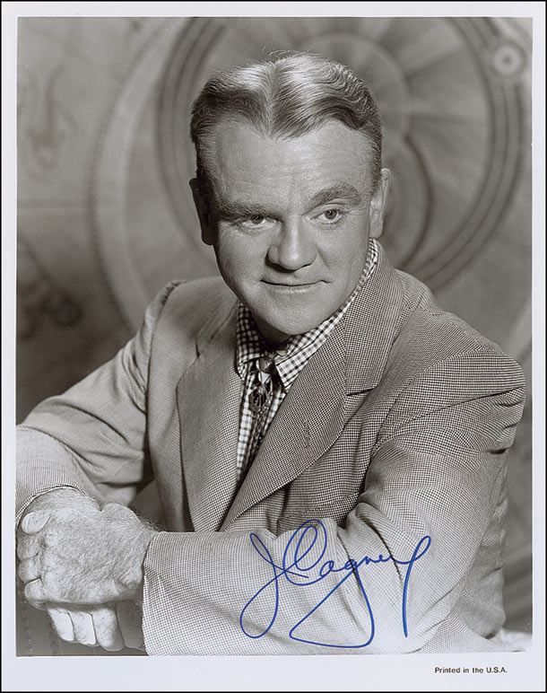 Glossy 8 x 10 photo of the middle-aged actor, signed in blue felt tip, “J. Cagney.” Scattered creases and surface marks, otherwise fine condition.