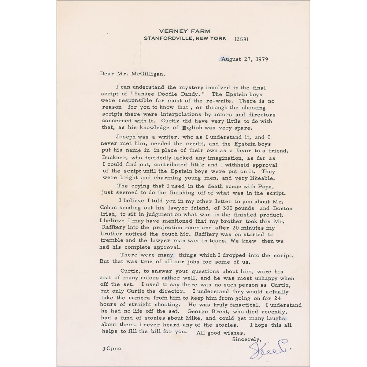 TLS signed “Jim C.,” one page, 7.25 x 10.5, Verney Farm letterhead, August 27, 1979. Cagney writes an admirer. In part: “I can understand the mystery involved in the final script of ‘Yankee Doodle Dandy.’ The Epstein boys were responsible for most of the re-write. There is no reason for you to know that, or through the shooting scripts there were interpolations by actors and directors concerned with it. Curtiz did have very little to do with that, as his knowledge of English was very spare…and the Epstein boys put his name in in place of their own as a favor to a friend…The crying that I used in the death scene with Papa, just seemed to do the finishing off of what was in the script. I believe I told you in my other letter to you about Mr. Cohan sending out his lawyer friend, of 300 pounds and Boston Irish, to sit in judgment on what was in the finished product…after 20 minutes…the lower man was in tears. We knew then we had his complete approval. There were many things which dropped into the script. But that was true of all our jobs for some of us. Curtiz, to answer your questions about him, wore his coat of many colors rather well, and he was most unhappy when off the set. I used to say there was no such person as Curtiz, but only Curtiz the director. I understand they would actually take the camera from him to keep him from going on for 24 hours of straight shooting. He was truly fanatical. I understand he had no life off the set.” In fine condition, with intersecting horizontal and vertical folds. A unique firsthand perspective of Cagney’s Academy Award–winning role, brimming with colorful anecdotes and directly mentioning famed director Michael Curtiz and the Academy Award winning screenwriting Epstein brothers.