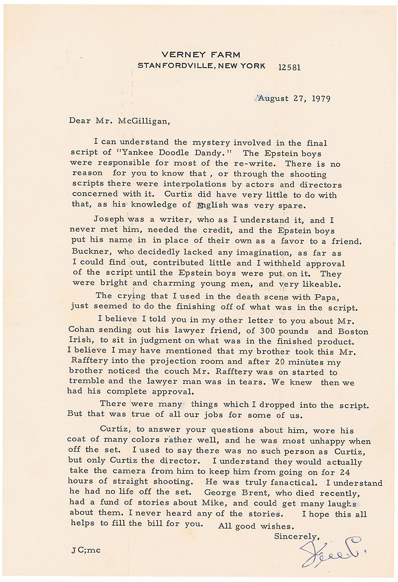 TLS signed “Jim C.,” one page, 7.25 x 10.5, Verney Farm letterhead, August 27, 1979. Cagney writes an admirer. In part: “I can understand the mystery involved in the final script of ‘Yankee Doodle Dandy.’ The Epstein boys were responsible for most of the re-write. There is no reason for you to know that, or through the shooting scripts there were interpolations by actors and directors concerned with it. Curtiz did have very little to do with that, as his knowledge of English was very spare…and the Epstein boys put his name in in place of their own as a favor to a friend…The crying that I used in the death scene with Papa, just seemed to do the finishing off of what was in the script. I believe I told you in my other letter to you about Mr. Cohan sending out his lawyer friend, of 300 pounds and Boston Irish, to sit in judgment on what was in the finished product…after 20 minutes…the lower man was in tears. We knew then we had his complete approval. There were many things which dropped into the script. But that was true of all our jobs for some of us. Curtiz, to answer your questions about him, wore his coat of many colors rather well, and he was most unhappy when off the set. I used to say there was no such person as Curtiz, but only Curtiz the director. I understand they would actually take the camera from him to keep him from going on for 24 hours of straight shooting. He was truly fanatical. I understand he had no life off the set.” In fine condition, with intersecting horizontal and vertical folds. A unique firsthand perspective of Cagney’s Academy Award–winning role, brimming with colorful anecdotes and directly mentioning famed director Michael Curtiz and the Academy Award-winning screenwriting Epstein brothers.