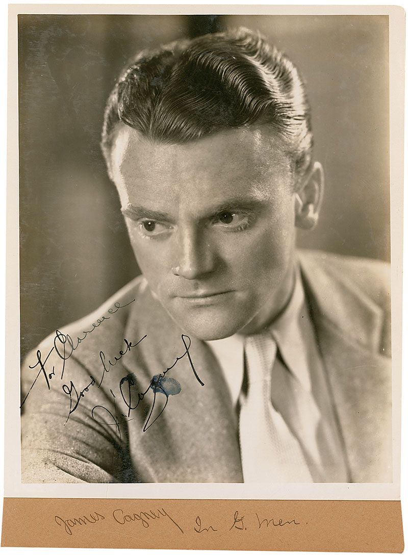 Vintage glossy 8 x 10 head-and-shoulders photo, signed and inscribed in fountain pen “To Clarence, Good luck, Jim Cagney.” Photo is affixed to a slightly larger light brown scrapbook page. In very good condition, with rubbing and irregular areas of finish from adhesive on reverse, an ink spot to last name of signature, as well as a small brush.