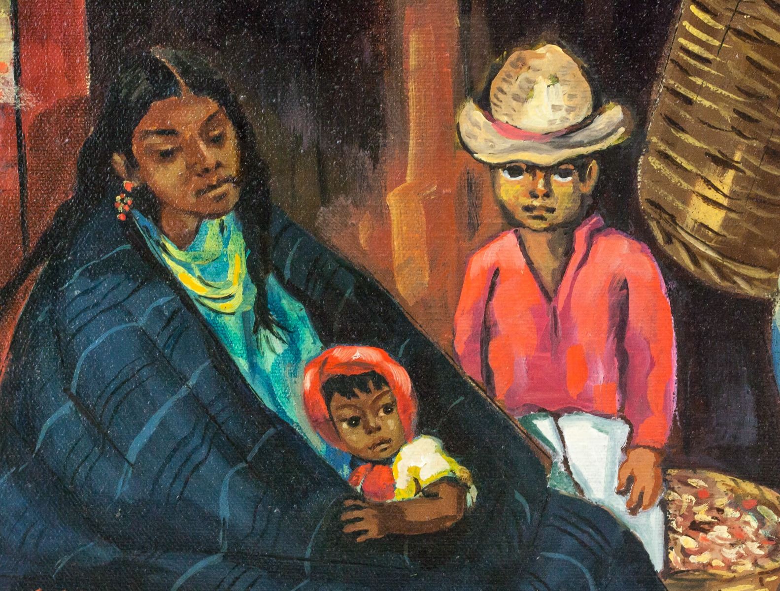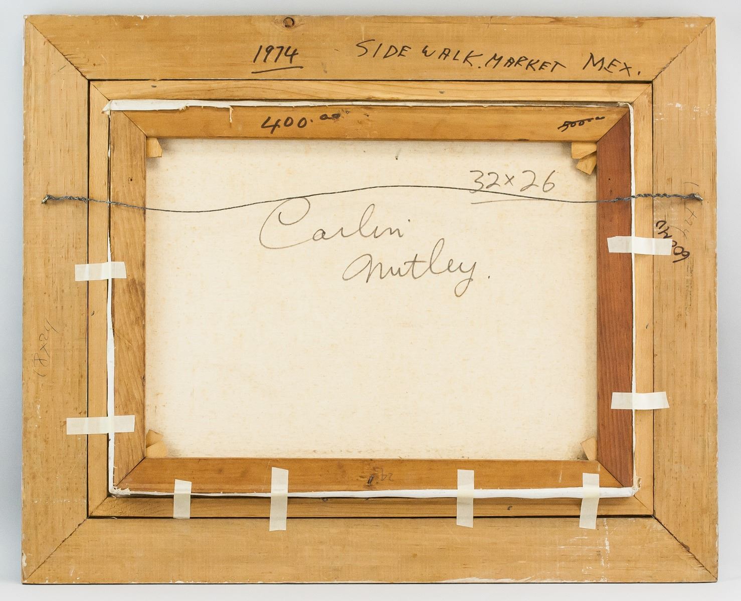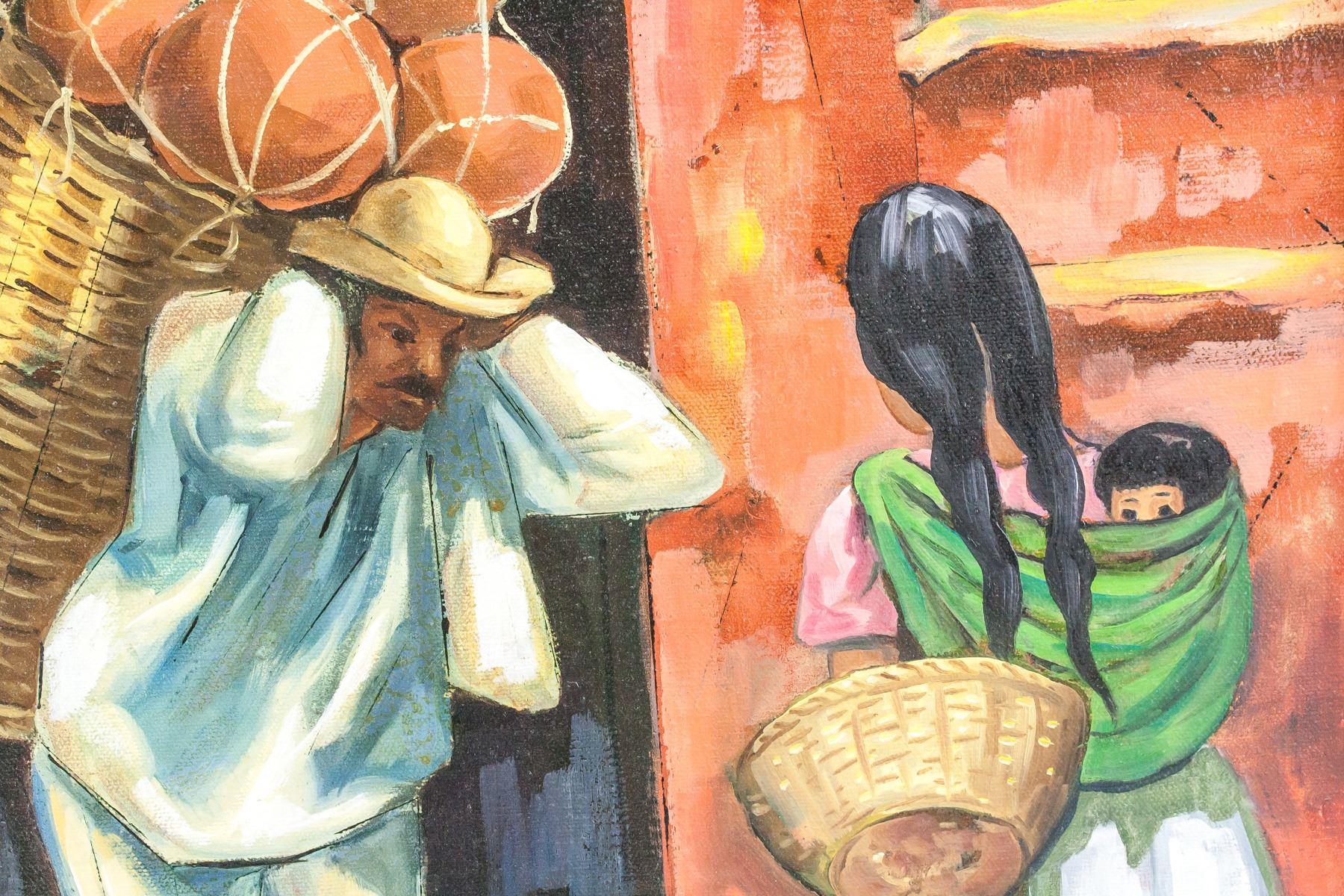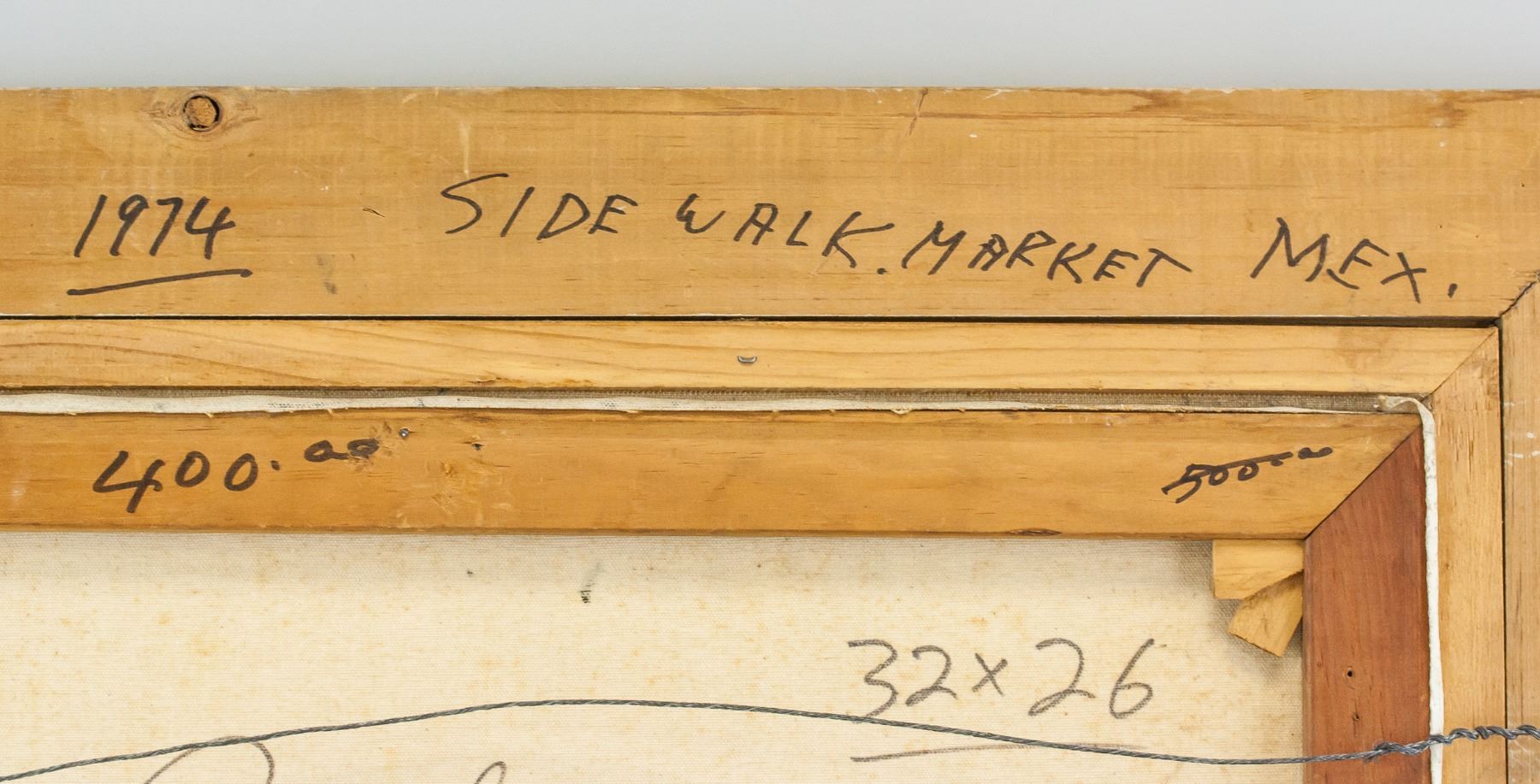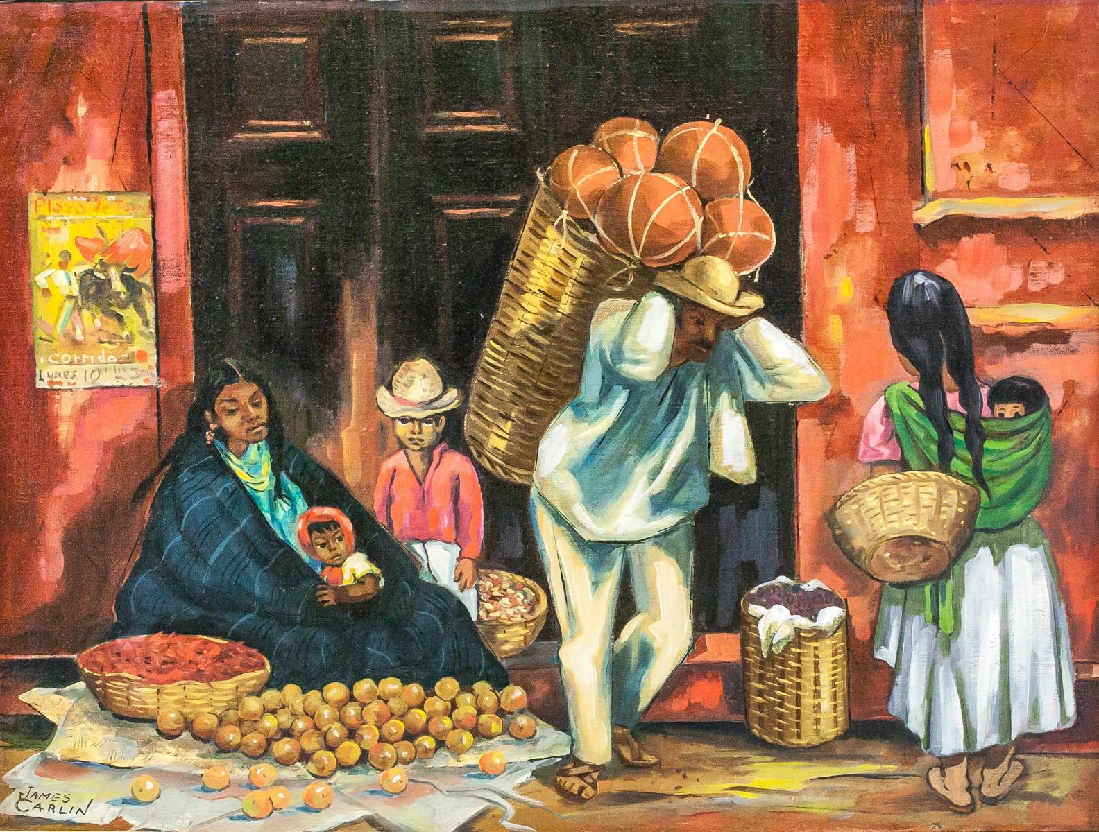 Oil on canvas, framed. Featuring street scene with a woman and and two children selling oranges on the street. Signed by James Carlin (1906-2005, Irish-American) on the bottom left corner. "600MD""400.00", "32 x 26", "Carlin Nutley", "1974", and "SIDEWALK MARKET MEX" inscribed on verso. 46 x 61 cm (18 x 24 inches). Framed size: 67 x 81 cm (32 x 26 inches). Born June 15, 1906 in Belfast, Ireland, James Carlin became a noted painter in mod-realist style of genre, figure, landscape and still life. Mediums included oil, pastel, watercolor as well as stained glass and graphics. Watercolor was a specialty. Carlin's work has been exhibited in the Metropolitan Museum of Art, the National Academy of Design, the International Show at the Brooklyn Museum, and the Pennsylvania Academy. It has been shown throughout America as well as Europe and is part of many private and museum collections including the Montclair Art Museum and the Bissell Bedard Galleries in Utica, N.Y. PROVENANCE: Toronto Estate