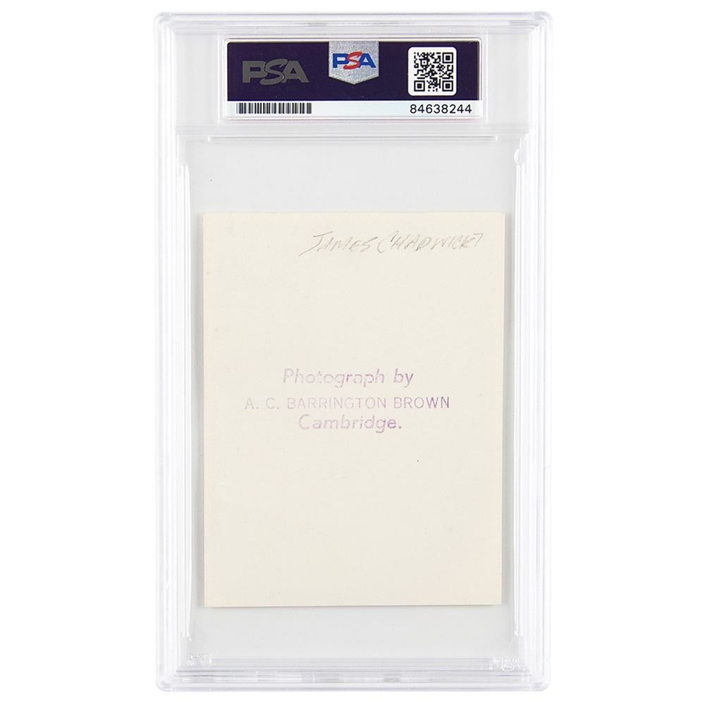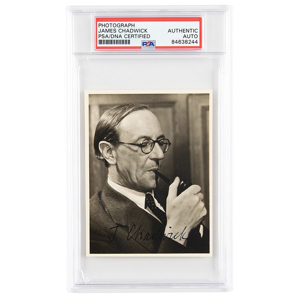 Vintage matte-finish 3.25 x 4.25 photo of Chadwick smoking his pipe, signed in fountain pen, "J. Chadwick." Reverse bears the credit stamp of "A. C. Barrington Brown, Cambridge." In very fine condition. Encapsulated in a PSA/DNA authentication holder.