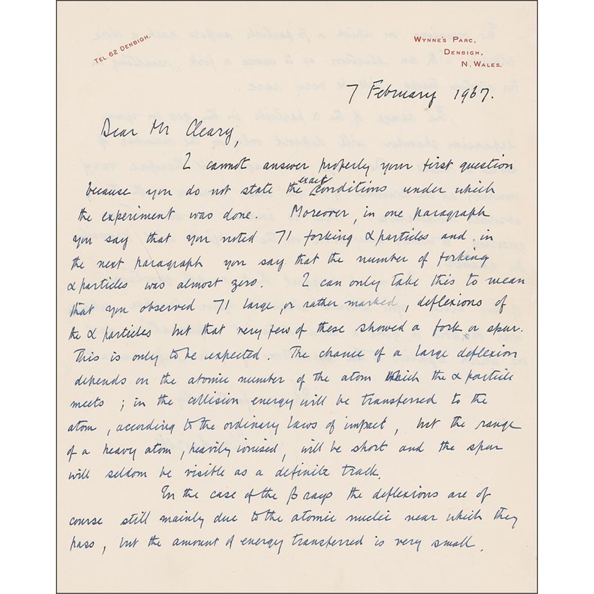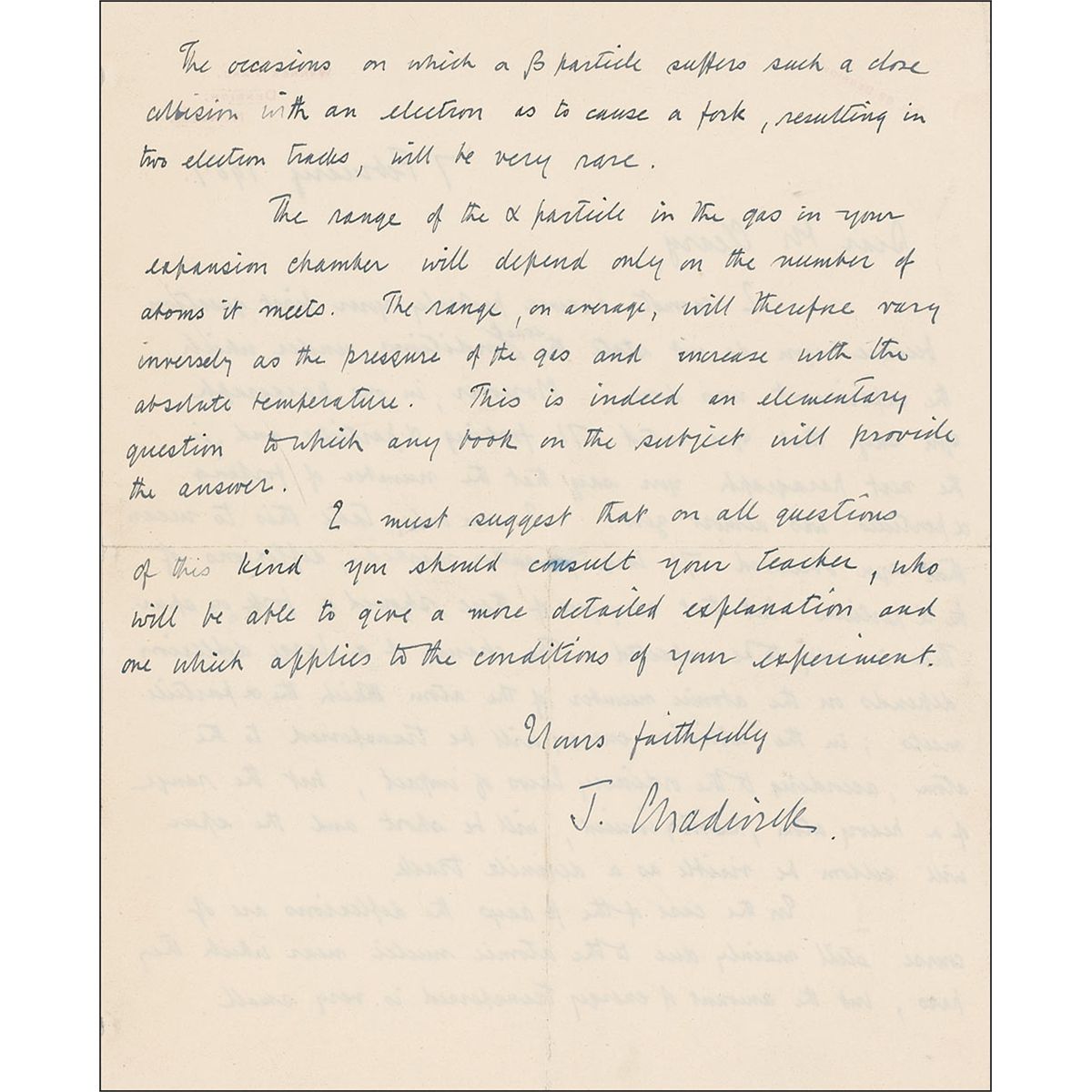 Winner of the 1935 Nobel Prize in Physics, he discovered the neutron for the atomic bomb. ALS signed “J. Chadwick,” one page both sides, 8 x 10, personal letterhead, February 7, 1967. Responding to a student regarding recent experiments, Chadwick writes, in part: “I cannot answer properly your first question because you do not state the exact conditions under which the experiment was done. Moreover, in one paragraph you say that you noted 71 forking alpha particles and in the next paragraph you say that the number of forking alpha particles was almost zero. I can only take this to mean that you observed 71 large, or rather marked, deflexions of the alpha particles but that very few of these showed a fork or spur. This is only to be expected. The chance of a large deflexion depends on the atomic number of the atom which the alpha particle meets; in the collision energy will be transferred to the atom, according to the ordinary laws of impact, but the range of a heavy atom, heavily ionised, will be short and the spur will seldom be visible as a definite track. In the case of the B rays the deflexions are of course still mainly due to the atomic nuclei near which they pass, but the amount of energy transferred is very small. The occasions on which a B particle suffers such a close collision with an electron as to cause a fork, resulting in two electron tracks, will be very rare. The range of the alpha particle in the gas in your expansion chamber will depend only on the number of atoms it meets. The range, on average, will therefore vary inversely as the pressure of the gas and increase with the absolute temperature. This is indeed an elementary question to which any book on the subject will provide the answers. I must suggest that on all questions of this kind you should consult your teacher, who will be able to give a more detailed explanation and one which applies to the conditions of your experiment.” Central horizontal and vertical fold, a few light areas of brushing, and two small impressions at the bottom left corner, none of which affect the crisp signature, otherwise fine condition. In an impressive letter brimming with ample scientific jargon, Chadwick takes a step down from his own work to mentor a pupil in need.