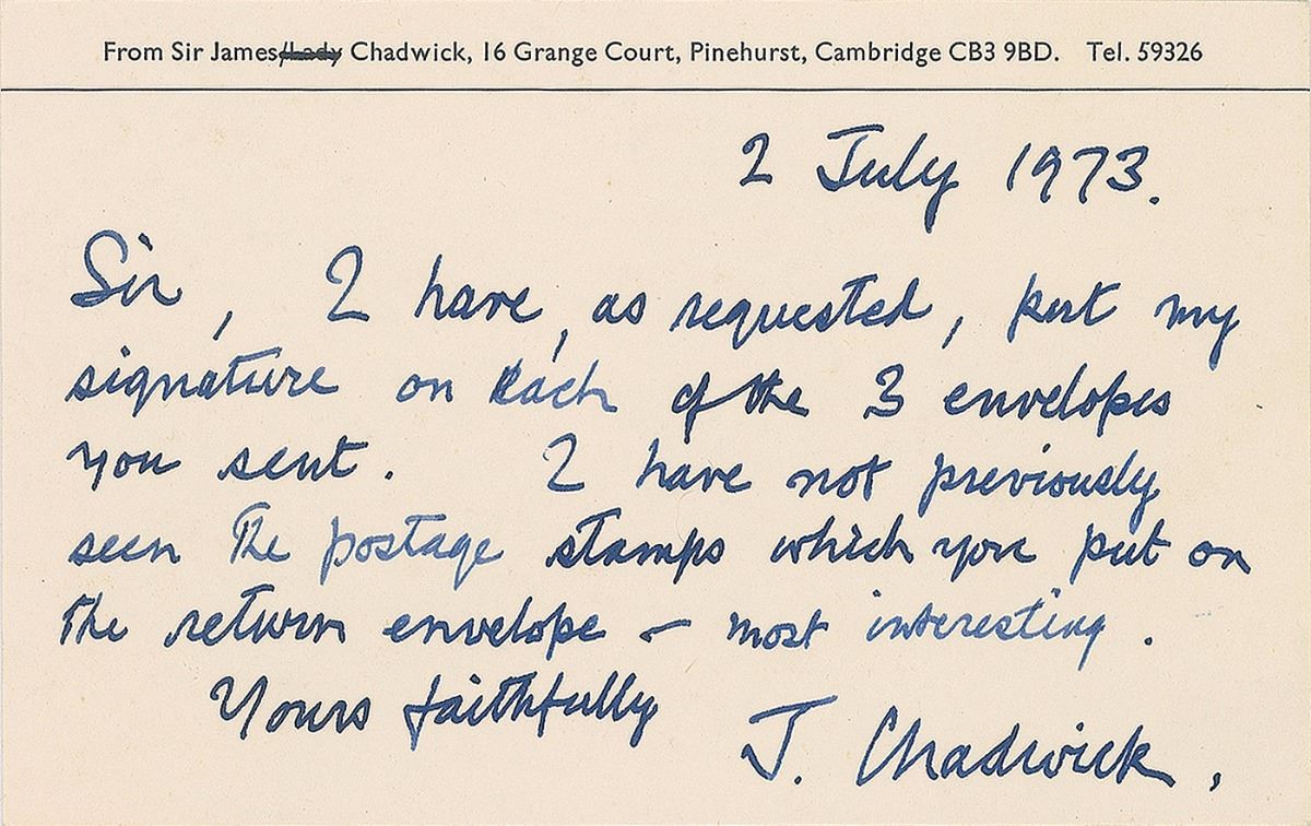 English physicist (1891–1974) who was awarded the 1935 Nobel Prize in Physics for his discovery of the neutron in 1932, thus paving the way towards the fission of uranium-235 and the creation of the atomic bomb. ALS signed “J. Chadwick,” one page, 5.5 x 3.5, personal letterhead, July 2, 1973. Response to an autograph request. In full: “I have, as requested, put my signature on each of the 3 envelopes you sent. I have not previously seen the postage stamps which you put on the return envelope—most interesting.” In fine condition.