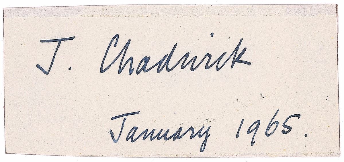 English physicist (1891–1974) who was awarded the 1935 Nobel Prize in Physics for his discovery of the neutron in 1932, thus paving the way towards the fission of uranium-235 and the creation of the atomic bomb. Fountain pen signature, “J. Chadwick, January 1965,” on an off-white 3.5 x 1.5 card. In fine condition, with trimmed edges.