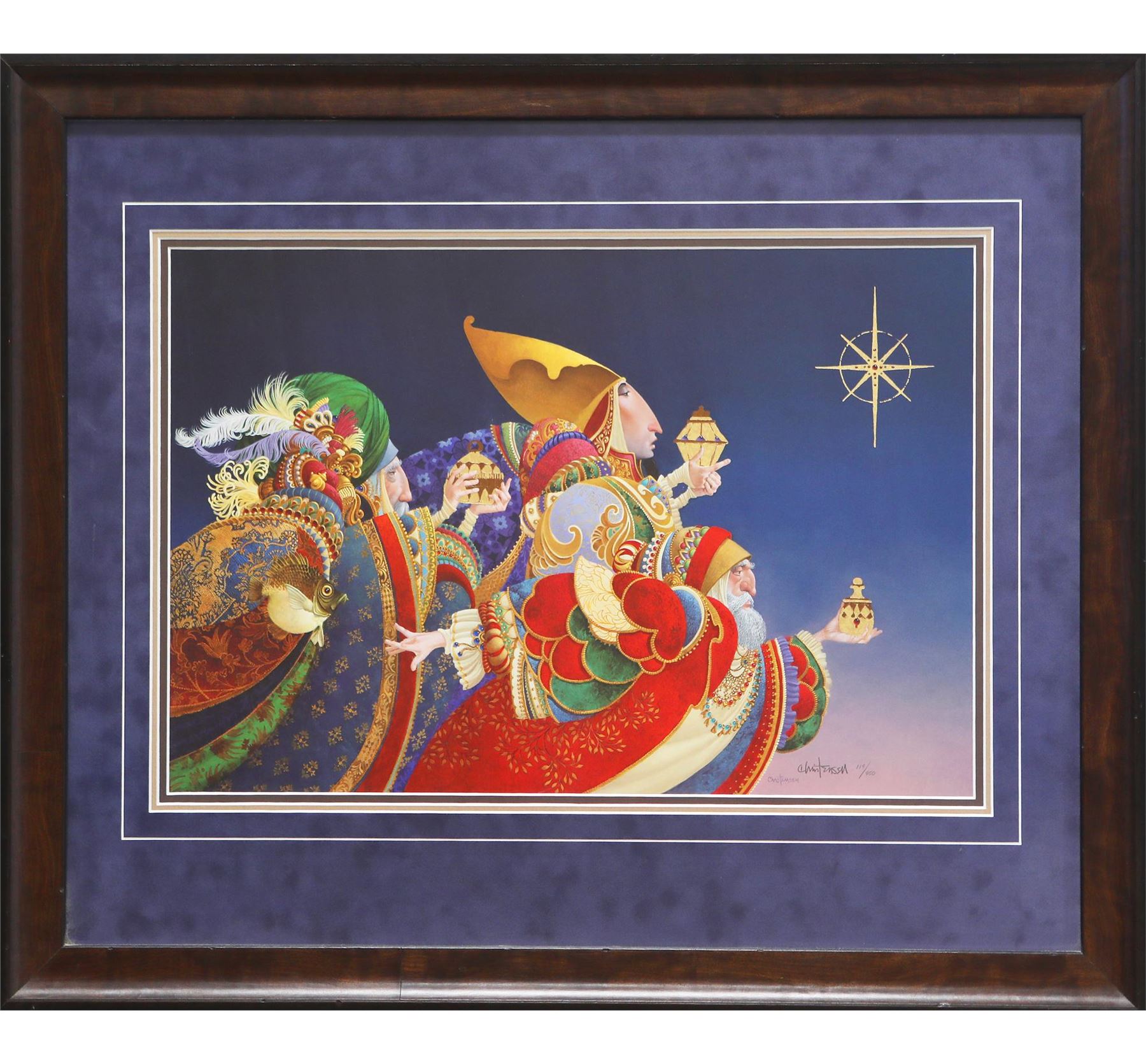 James Christensen's "We Three Kings" limited edition print signed and numbered 119/950. This print is in mint condition, has been professionally triple matted, and custom framed under glass. Image- 13 3/4" x 20". Frame- 24 1/4" x 29".