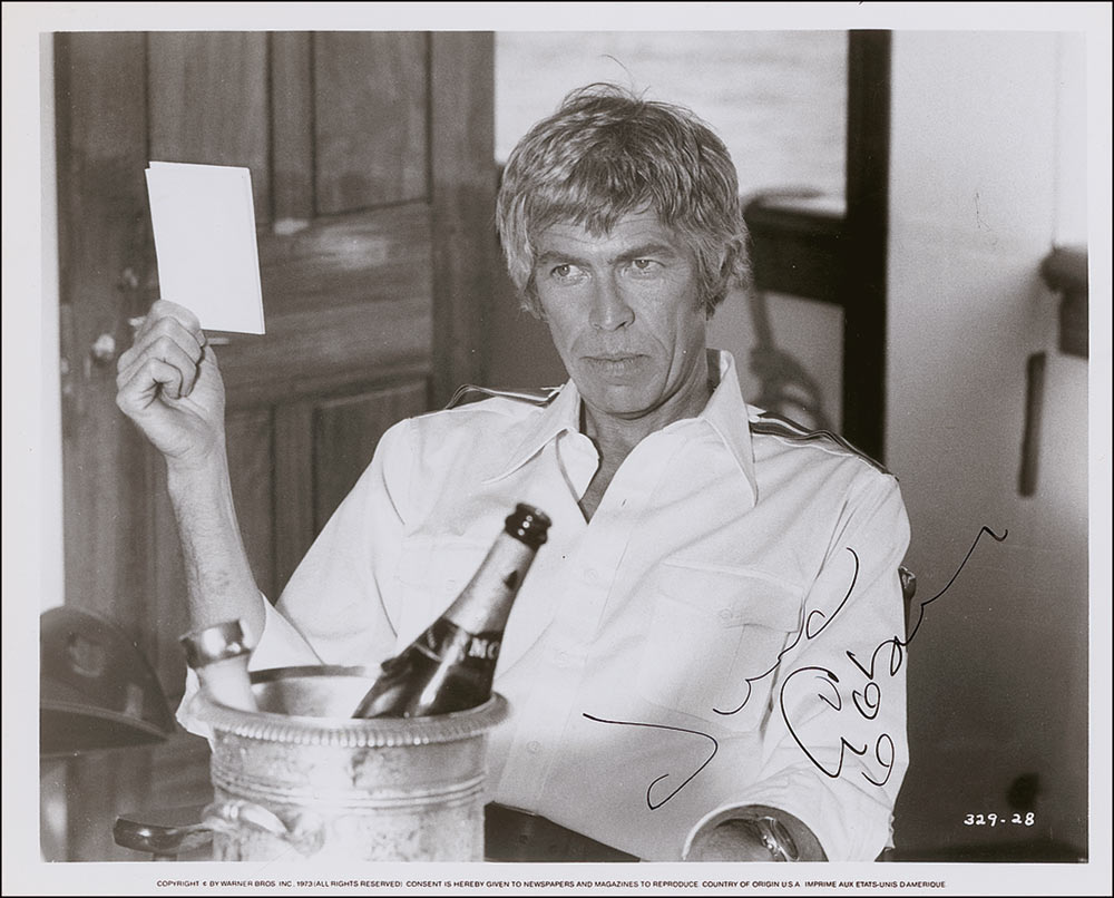 Glossy 10 x 8 Warner Bros. publicity photo from The Last of Sheila, signed in black ink. In fine condition, with some scattered light surface marks and dings.
