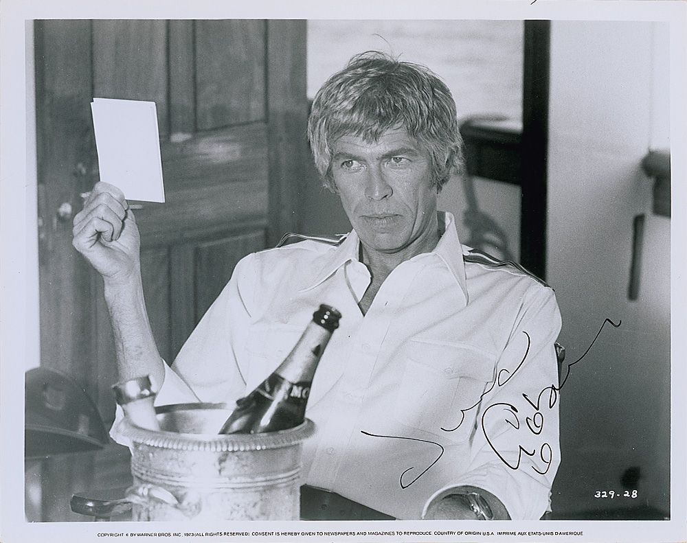 Glossy 10 x 8 Warner Brothers publicity photo for The Last of Sheila, signed in-person in black fountain pen. In fine condition, with scattered mild creases.