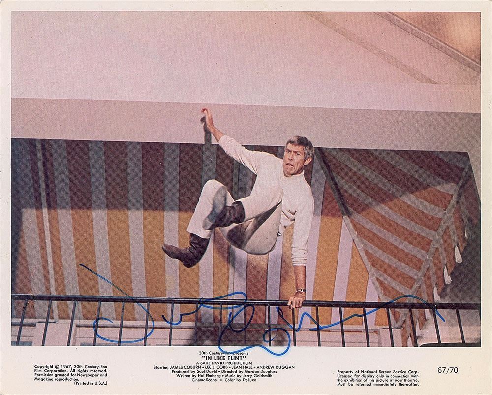 Color 20th Century Fox mini lobby card for the 1967 film In Like Flint, 10 x 8, signed in blue felt tip by Coburn. In fine condition. From the Harvey and Rhoda Kuflik Collection.