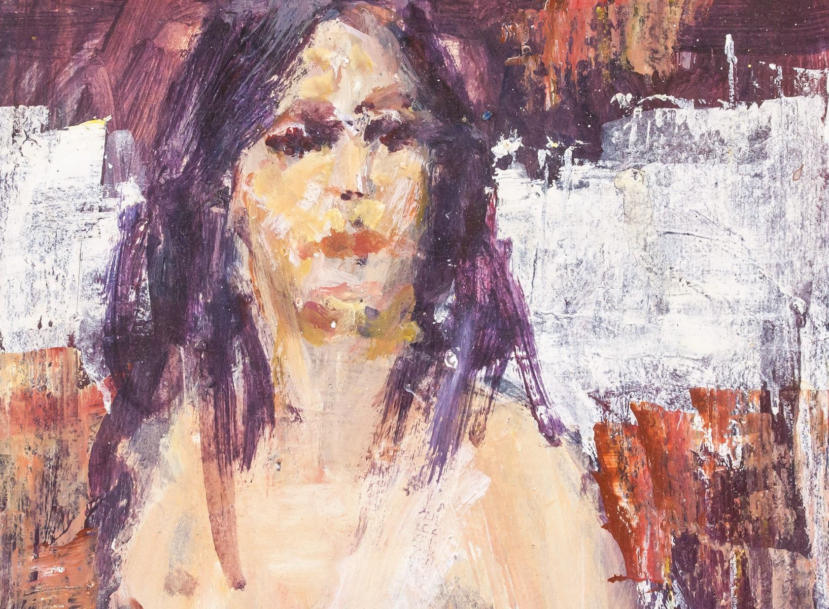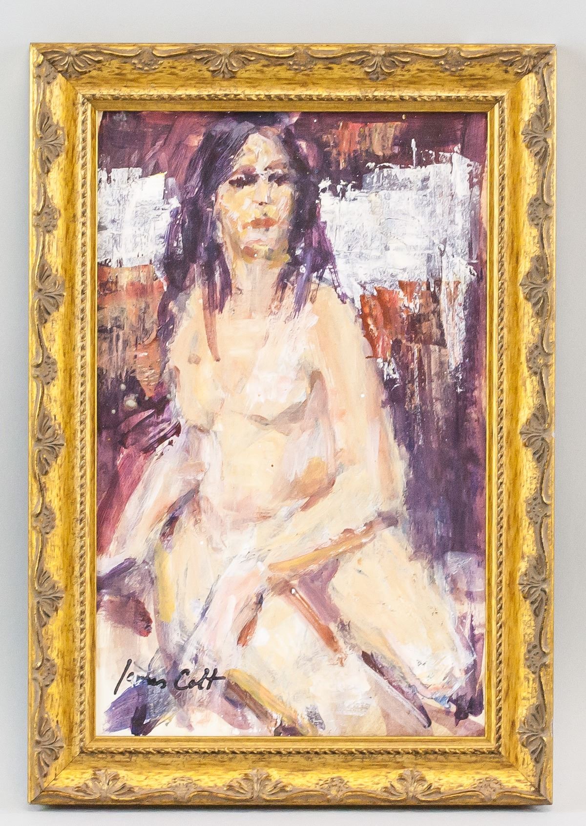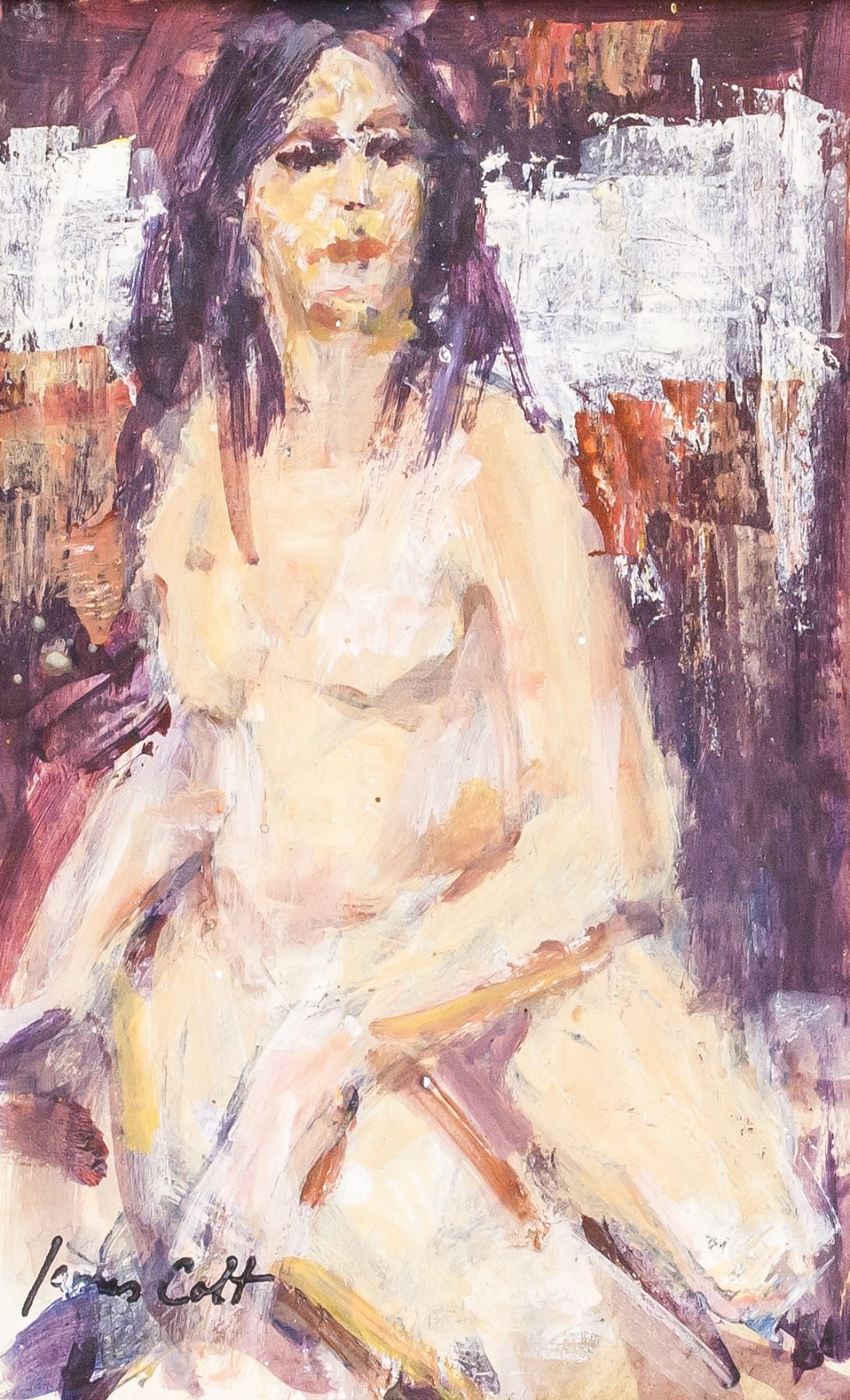 Acrylic on board, framed. Featuring portrait of nude woman. Signed "James Colt" in the bottom left corner. Attributed to James Lee Colt (1922-2005, American). 31 x 19 cm (12 x 7.5 in), Frame: 38 x 26 cm (15 x 10.5 in). Provenance: This lot carries limited provenance from a Private American collection, Los Angeles, CA