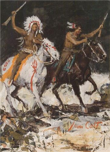 James Colt (1922-2005). "The Charge". 11" x 8". Oil on Board. (est $600-800). Colt studied with Burt Procter and emulated his style.