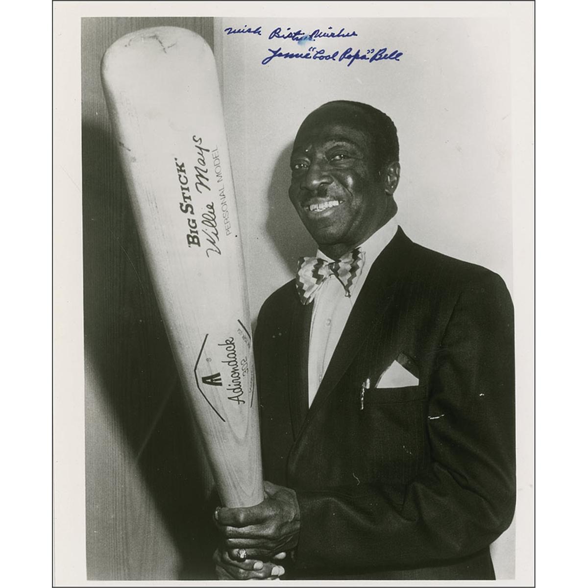 Glossy 8 x 10 photo of Bell holding an immense Adirondack bat, signed pre-stroke in blue felt tip, “With Best Wishes, James ‘Cool Papa’ Bell.” In fine condition, with a few fingertip smudges and a small ink smear on the sentiment.