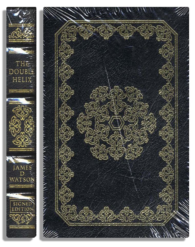 Nobel Prize winning scientist, James D. Watson's signed collector's edition of ''The Double Helix.'' Norwalk, Connecticut: Easton Press: 2009. Black leather book has decorative 22 karat gold detailing on cover and page edges. Volume measures 6.5'' x 9.5'' and remains sealed in original shrink wrap. Contains satin ribbon page marker and smyth-sewn pages. Fine condition.