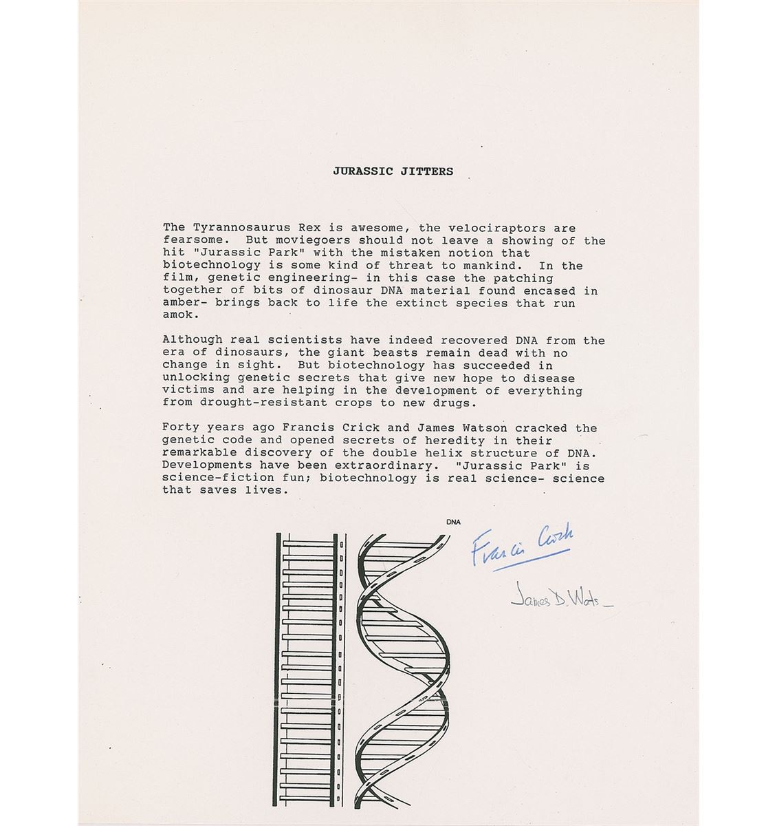 Souvenir typescript, one page, 8.5 x 11, entitled ‘Jurassic Jitters,’ featuring two printed sketches of DNA strands at the bottom, and signed at the conclusion in blue ink, “Francis Crick,” and in black ink, “James D. Watson.” In part: “The Tyrannosaurus Rex is awesome, the velociraptors are fearsome. But moviegoers should not leave a showing of the hit ‘Jurassic Park’ with the mistaken notion that biotechnology is some kind of threat to mankind…Although real scientists have indeed recovered DNA from the era of dinosaurs, the giant beasts remain dead, with no change in sight.” In fine condition.
