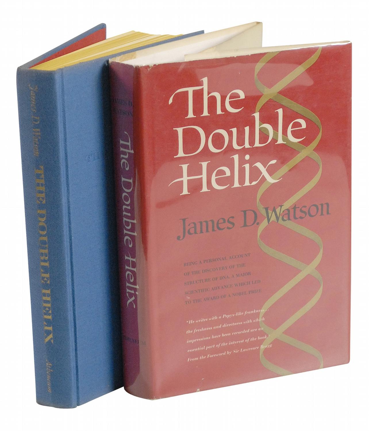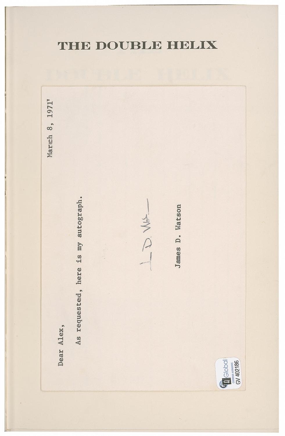 TLS, one page on a 6 x 4 card, March 8, 1971. Watson responds to an autograph request. In full: “Dear Alex, As requested, here is my autograph.” Letter is affixed to the half-title page of a hardcover first edition of The Double Helix. In fine condition, with an authentication label affixed to lower left corner of letter. Book rates overall fine condition with a prior owner’s name on the inside board, light wear, and faint sunning to the spine.