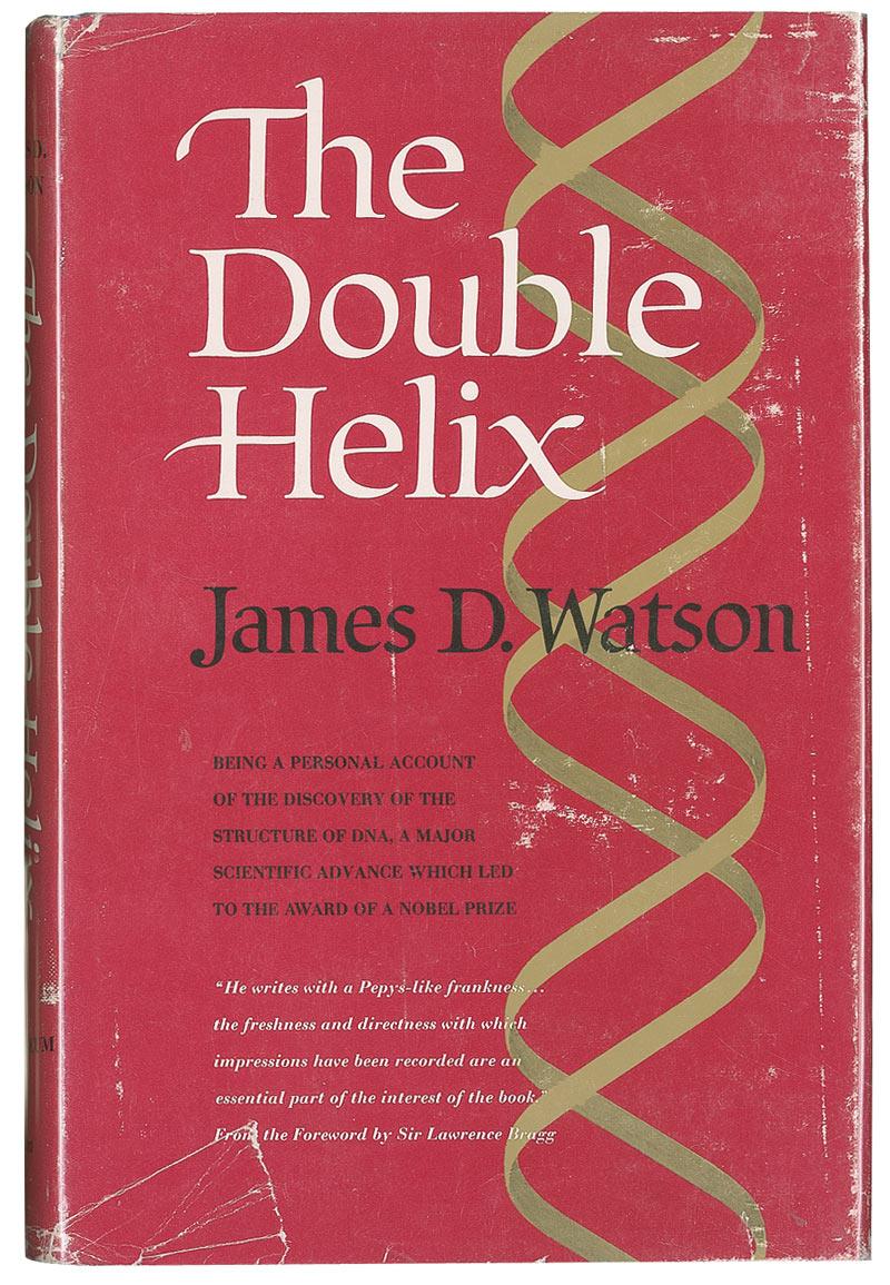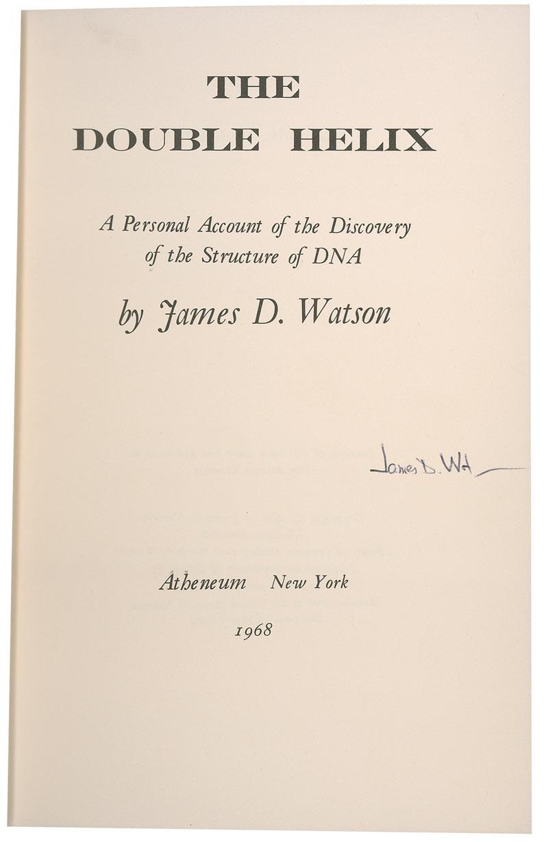 Signed book: The Double Helix. NY: Atheneum, 1968. Hardcover with dustjacket, 5.5 x 8.5, 226 pages. Signed in black ballpoint in Watson’s diminutive script on the title page. In fine condition, with crossed-out ownership stamp on the first free end page, jacket a little scuffed and worn, and also creased along bottom margin.