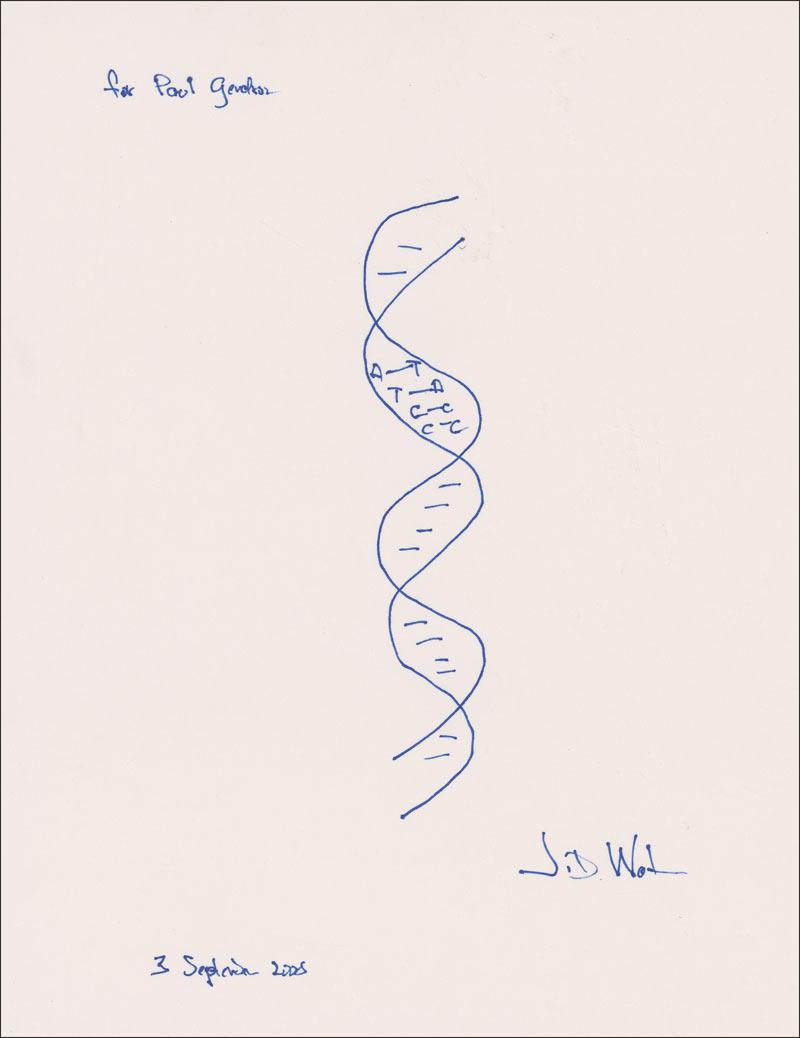 Co-winner of the 1962 Nobel Prize for Physiology and Medicine for the discovery of DNA. Rare original oversized signed and inscribed felt tip sketch of a detailed DNA strand on an off-white 8.5 x 11 card, signed and inscribed “For Paul Gendron, J. D. Watson 3 September 2008.” In very fine condition. The inscription could easily be matted out. Actual sketches are highly prized among collectors, with this example being the largest we have seen.