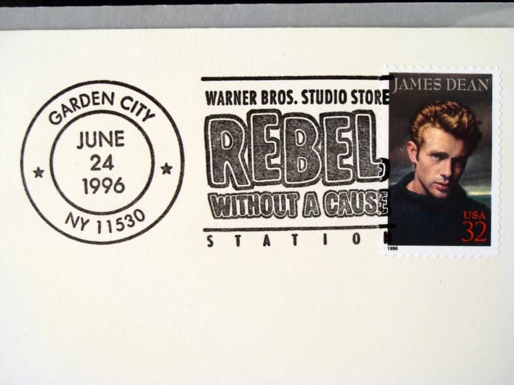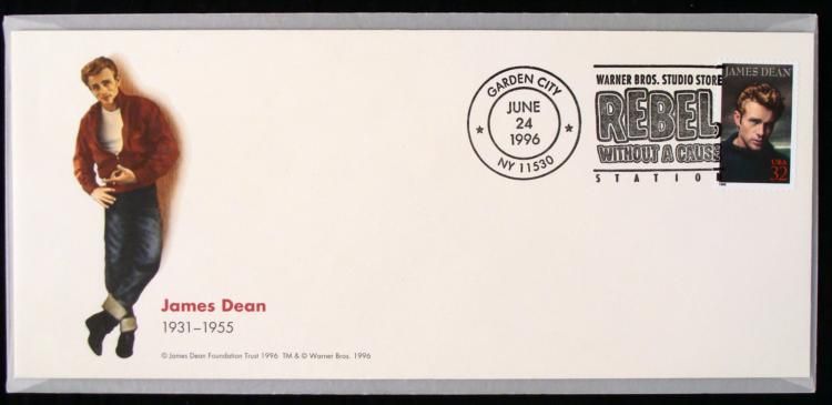 Warner Brothers Studio Stores celebrate "Rebel Without a Cause" and the introduction of the U.S. Postage Stamp honoring James Dean. On the front there is picture of James Dean, with his name and the short years of popularity and fame he shared with us * (left side). On the right side, there is a ink stamp that reads "Warner Bros. Studio Store - Rebel Without a Cause - Station with a postage stamp of James Dean. To the left of the ink stamp, is the post mark that reads "Garden City - June 24, 1995 - NY 11530". * The cache envelope comes in a protective wax envelope and is in mint condition.