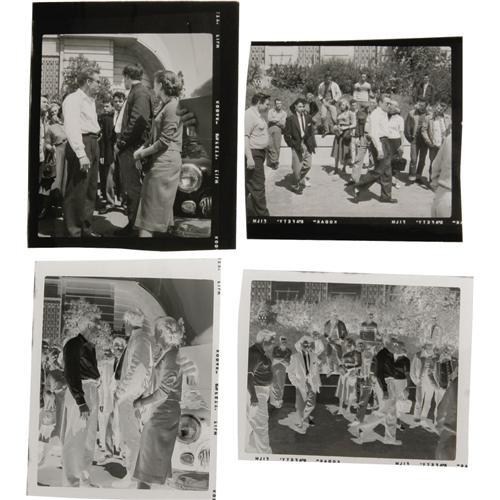 <B>James Dean Contact Proofs from "Rebel Without a Cause" with Negatives.</B></I> These shots present James Dean rehearsing in dark glasses as his character haplessly enters his new high school. Natalie Wood is seen in one (from the rear), and Sal Mineo is in both along with supporting players. Negatives included.<BR><BR><b>Shipping:</b> Flat Material, Small (<a target="_blank" href="http://www.heritageauctions.com/common/shipping.php">view shipping information</a>)