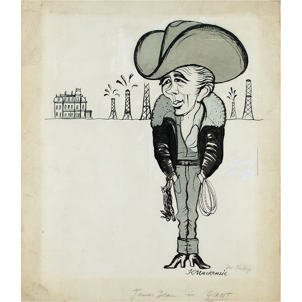 Original pen-and-ink drawing of James Dean as Jett Rink in the 1956 film Giant, accomplished by cartoonist Keith MacKenzie on an off-white 13.5 x 15.75 sheet, signed at the bottom by the artist, "K. MacKenzie," with an inscription in pencil, "For Phillip." The cartoon was published in London's Daily Mail in 1956. In very good to fine condition, with some creasing, and light overall soiling. Accompanied by a mat for display.