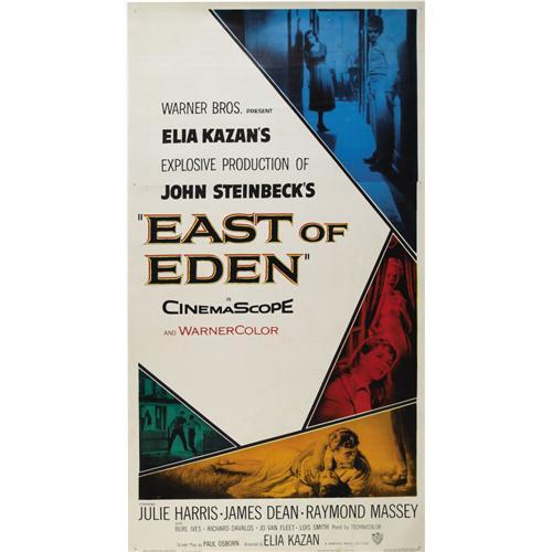 <B>"East of Eden" (Warner Brothers, 1955).</B></I> Three Sheet (41" X 81"). Like all three sheets of this era, this original release poster was folded and has some wear and paper loss at the fold lines. A stamp on the back has faintly bled through into the orange image section. There are also pinholes at the corners and a few faint scuffs. Thanks to a very nice restoration, this gorgeous large format poster is ready for display. Fine+ on linen. <I>From the James Dean Museum archive.</B></I>