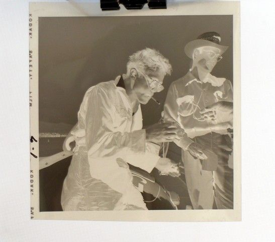 A great rare find for James Dean collectors. From the personal collection of Gus V. Vignolle, well known journalist, photographer and publisher of "MotoRacing", one of the first and most influential car racing newspapers of the 1950’s. This is one in a limited series of negatives that have been missing for over 50 years until recently re-discovered by Vignolle’s daughter, Zaz Clark. These intimate photos are of James Dean in and around his Speedster 23F Porsche (License Plate #2U73378) that he bought at Competition Motors in Hollywood. They were taken during his infamous car race in Palm Springs, California in March of 1955 which was his first official race, and which he won not long before his accident in September of that year in his new Porsche Spyder 550 while on his way to a race in Salinas, California. These photographs only appeared once in the January 13th 1956 (Vol 1, No. 7) exclusive, fully-illustrated memorial issue of MotoRacing. This is the one and only original Black and White negative photographed and developed by Vignolle on Kodak Safety Film, taken at the race. It shows a very candid photo of a nervous James Dean just before the race is about to start, sitting on the back of his Speedster, cigarette in his mouth, as one of his crew members has just given him a match. One of the race track officials stands to his right, his stop watch in his pocket. Dean wears sunglasses and his iconic racing overalls. The negative comes with a COA, plus full copyright release for unlimited reproduction printing to the winning bidder. The Negative is carefully packed in a wax envelope, and includes a positive proof photo. Also Includes a copy of the MotoRacing issue. (Negative approx. 2 3/8" x 2 3/8" & photo approx. 5" x 4").