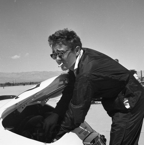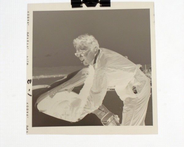 For James Dean fans and collectors a true find. From the personal collection of Gus V. Vignolle, well known journalist, photographer and publisher of "MotoRacing", one of the first and most influential car racing newspapers of the 1950’s. This is one in a limited series of negatives that have been missing for over 50 years until recently re-discovered by Vignolle’s daughter, Zaz Clark. These intimate photos are of James Dean in and around his Speedster 23F Porsche (License Plate #2U73378) that he bought at Competition Motors in Hollywood. They were taken during his infamous car race in Palm Springs, California in March of 1955 which was his first official race, and which he won not long before his accident in September of that year in his new Porsche Spyder 550 while on his way to a race in Salinas, California. These photographs only appeared once in the January 13th 1956 (Vol 1, No. 7) exclusive, fully-illustrated memorial issue of MotoRacing. This is the one and only original Black and White negative photographed and developed by Vignolle on Kodak Safety Film, taken at the race. It shows James Dean, his hands inside the rear engine of his Speedster, listening to the idol of his engine, as he makes final adjustments before the race. His cigarette hangs from his mouth, and he wears his sunglasses and iconic racing overalls. The negative comes with a COA, plus full copyright release for unlimited reproduction printing to the winning bidder. The Negative is carefully packed in a wax envelope, and includes a positive proof photo. Also Includes a copy of the MotoRacing issue. (Negative approx. 2 3/8" x 2 3/8" & photo approx. 5" x 4").