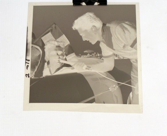 A major discovery for James Dean fans and collector's From the personal collection of Gus V. Vignolle, well known journalist, photographer and publisher of "MotoRacing", one of the first and most influential car racing newspapers of the 1950’s. This is one in a limited series of negatives that have been missing for over 50 years until recently re-discovered by Vignolle’s daughter, Zaz Clark. These intimate photos are of James Dean in and around his Speedster 23F Porsche (License Plate #2U73378) that he bought at Competition Motors in Hollywood. They were taken during his infamous first car race in Palm Springs, California in March of 1955, which he won, not long before his accident in September of that year in his new Porsche Spyder 550 while on his way to a race in Salinas, California. These photographs only appeared once in the January 13th 1956 (Vol 1, No. 7) exclusive, fully-illustrated memorial issue of MotoRacing. This is the one and only original Black and White negative photographed and developed by Vignolle on Kodak Safety Film, taken at the race. It shows suddenly relaxed and grinning Dean being interviewed by famous track announcer Jim Pollack while in his Speedster 23F before the race. This was the moment when Dean said that if he won the race he would leave acting and becoming a professional race car driver. He did win the race by 300 yards. The negative comes with a COA, plus full copyright release for unlimited reproduction printing to the winning bidder. The Negative is carefully packed in a wax envelope, and includes a positive proof photo. Also Includes a copy of the MotoRacing issue. (Negative approx. 2 3/8" x 2 3/8" & photo approx. 5" x 4").
