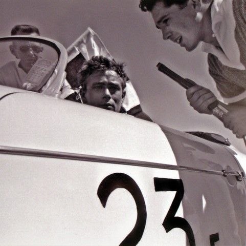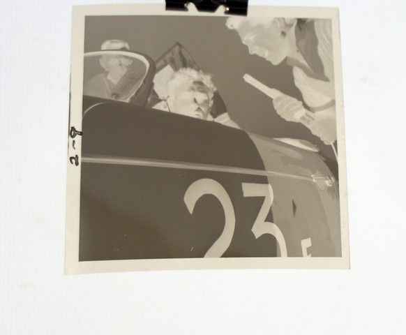 Something new and exciting for James Dean fans and collectors. From the personal collection of Gus V. Vignolle, well known journalist, photographer and publisher of "MotoRacing", one of the first and most influential car racing newspapers of the 1950’s. This is one in a limited series of negatives that have been missing for over 50 years until recently re-discovered by Vignolle’s daughter, Zaz Clark. These intimate photos are of James Dean in and around his Speedster 23F Porsche (License Plate #2U73378) that he bought at Competition Motors in Hollywood. They were taken during his infamous first car race in Palm Springs, California in March of 1955, which he won, not long before his accident in September of that year in his new Porsche Spyder 550 while on his way to a race in Salinas, California. These photographs only appeared once in the January 13th 1956 (Vol 1, No. 7) exclusive, fully-illustrated memorial issue of MotoRacing. This is the one and only original Black and White negative photographed and developed by Vignolle on Kodak Safety Film, taken at the race. It shows a focused and pensive Dean being interviewed by famous track announcer Jim Pollack while in his Speedster 23F before the race. The negative comes with a COA, plus full copyright release for unlimited reproduction printing to the winning bidder. The Negative is carefully packed in a wax envelope, and includes a positive proof photo. Also Includes a copy of the MotoRacing issue. (Negative approx. 2 3/8" x 2 3/8" & photo approx. 5" x 4").
