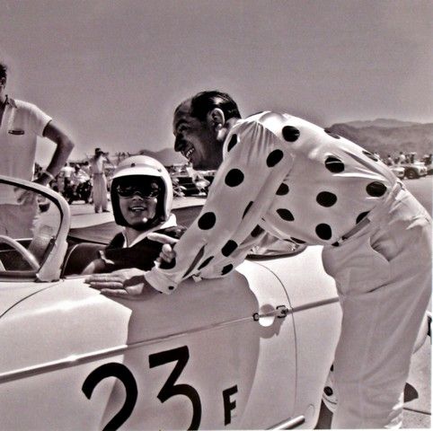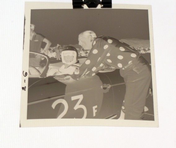 For James Dean fans and collectors an incredible discovery. From the personal collection of Gus V. Vignolle, well known journalist, photographer and publisher of "MotoRacing", one of the first and most influential car racing newspapers of the 1950’s. This is one in a limited series of negatives that have been missing for over 50 years until recently re-discovered by Vignolle’s daughter, Zaz Clark. These intimate photos are of James Dean in and around his Speedster 23F Porsche (License Plate #2U73378) that he bought at Competition Motors in Hollywood. They were taken during his infamous car race in Palm Springs, California in March of 1955 which was his first official race, and which he won not long before his accident in September of that year in his new Porsche Spyder 550 while on his way to a race in Salinas, California. These photographs only appeared once in the January 13th 1956 (Vol 1, No. 7) exclusive, fully-illustrated memorial issue of MotoRacing. This is the one and only original Black and White negative photographed and developed by Vignolle on Kodak Safety Film, taken at the race. It shows a smiling James Dean (who moments ago was terrified about his first race), being reassured by race track Starter Al Torres (in his famous polka dot shirt). Torres was much loved on the racing circuit and was known to put first timers, and intense racers at ease before each event. The negative comes with a COA, plus full copyright release for unlimited reproduction printing to the winning bidder. The Negative is carefully packed in a wax envelope, and includes a positive proof photo. Also Includes a copy of the MotoRacing issue. (Negative approx. 2 3/8" x 2 3/8" & photo approx. 5" x 4").