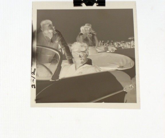 James Dean fans and collectors have something to celebrate. From the personal collection of Gus V. Vignolle, well known journalist, photographer and publisher of "MotoRacing", one of the first and most influential car racing newspapers of the 1950’s. This is one in a limited series of negatives that have been missing for over 50 years until recently re-discovered by Vignolle’s daughter, Zaz Clark. These intimate photos are of James Dean in and around his Speedster 23F Porsche (License Plate #2U73378) that he bought at Competition Motors in Hollywood. They were taken during his infamous car race in Palm Springs, California in March of 1955 which was his first official race, and which he won not long before his accident in September of that year in his new Porsche Spyder 550 while on his way to a race in Salinas, California. These photographs only appeared once in the January 13th 1956 (Vol 1, No. 7) exclusive, fully-illustrated memorial issue of MotoRacing. This is the one and only original Black and White negative photographed and developed by Vignolle on Kodak Safety Film, taken at the race. It shows James Dean, wearing his regular glasses, with his racing goggles on his forehead, as he continues to hold back before starting his first race, while he contemplates his strategy. A race official is seen leaning in "persuading" Dean to move his Porsche up to the staring position on the track. The negative comes with a COA, plus full copyright release for unlimited reproduction printing to the winning bidder. The Negative is carefully packed in a wax envelope, and includes a positive proof photo. Also Includes a copy of the MotoRacing issue. (Negative approx. 2 3/8" x 2 3/8" & photo approx. 5" x 4").
