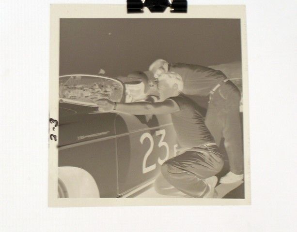 For all who love the legendary James Dean, a magnificent collectable. From the personal collection of Gus V. Vignolle, well known journalist, photographer and publisher of "MotoRacing", one of the first and most influential car racing newspapers of the 1950’s. This is one in a limited series of negatives that have been missing for over 50 years until recently re-discovered by Vignolle’s daughter, Zaz Clark. These intimate photos are of James Dean in and around his Speedster 23F Porsche (License Plate #2U73378) that he bought at Competition Motors in Hollywood. They were taken during his infamous car race in Palm Springs, California in March of 1955 which was his first official race, and which he won not long before his accident in September of that year in his new Porsche Spyder 550 while on his way to a race in Salinas, California. These photographs only appeared once in the January 13th 1956 (Vol 1, No. 7) exclusive, fully-illustrated memorial issue of MotoRacing. This is the one and only original Black and White negative photographed and developed by Vignolle on Kodak Safety Film, taken at the race. It shows an extremely focused and serious James Dean, wearing his racing helmet and glasses, looking out at the track he's about to go on, as his friend and mechanic Bill Tunstall and a racing official give him last minute advice and instructions. The negative comes with a COA, plus full copyright release for unlimited reproduction printing to the winning bidder. The Negative is carefully packed in a wax envelope, and includes a positive proof photo. Also Includes a copy of the MotoRacing issue. (Negative approx. 2 3/8" x 2 3/8" & photo approx. 5" x 4").