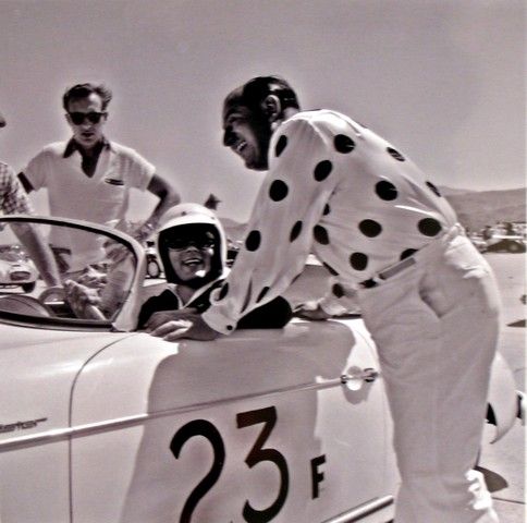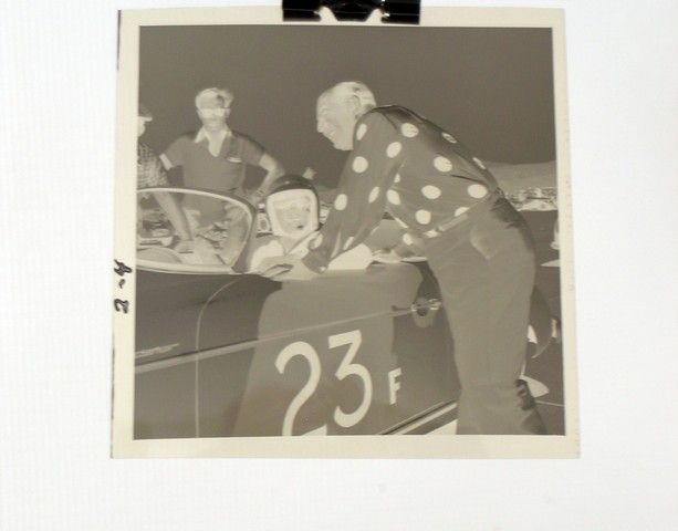 After over half a century, James Dean memorabilia surfaces for all fans and collectors. From the personal collection of Gus V. Vignolle, well known journalist, photographer and publisher of "MotoRacing", one of the first and most influential car racing newspapers of the 1950’s. This is one in a limited series of negatives that have been missing for over 50 years until recently re-discovered by Vignolle’s daughter, Zaz Clark. These intimate photos are of James Dean in and around his Speedster 23F Porsche (License Plate #2U73378) that he bought at Competition Motors in Hollywood. They were taken during his infamous car race in Palm Springs, California in March of 1955 which was his first official race, and which he won not long before his accident in September of that year in his new Porsche Spyder 550 while on his way to a race in Salinas, California. These photographs only appeared once in the January 13th 1956 (Vol 1, No. 7) exclusive, fully-illustrated memorial issue of MotoRacing. This is the one and only original Black and White negative photographed and developed by Vignolle on Kodak Safety Film, taken at the race. It shows James Dean finally breaking a smile after sitting in his Speedster 23F for a long time (and delaying the race), and finally getting ready to move to his assigned fourth position, with the help of legendary track Starter Al Torres (in his famous polka dot shirt). Track announcer Jim Pollack stands behind them, waiting to start the race! The negative comes with a COA, plus full copyright release for unlimited reproduction printing to the winning bidder. The Negative is carefully packed in a wax envelope, and includes a positive proof photo. Also Includes a copy of the MotoRacing issue. (Negative approx. 2 3/8" x 2 3/8" & photo approx. 5" x 4").