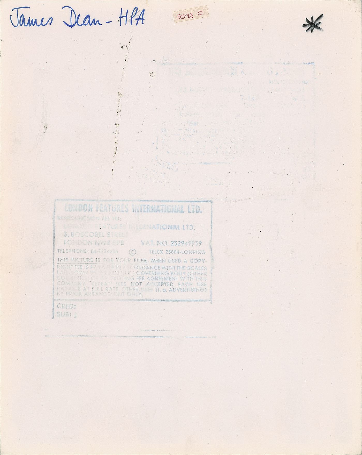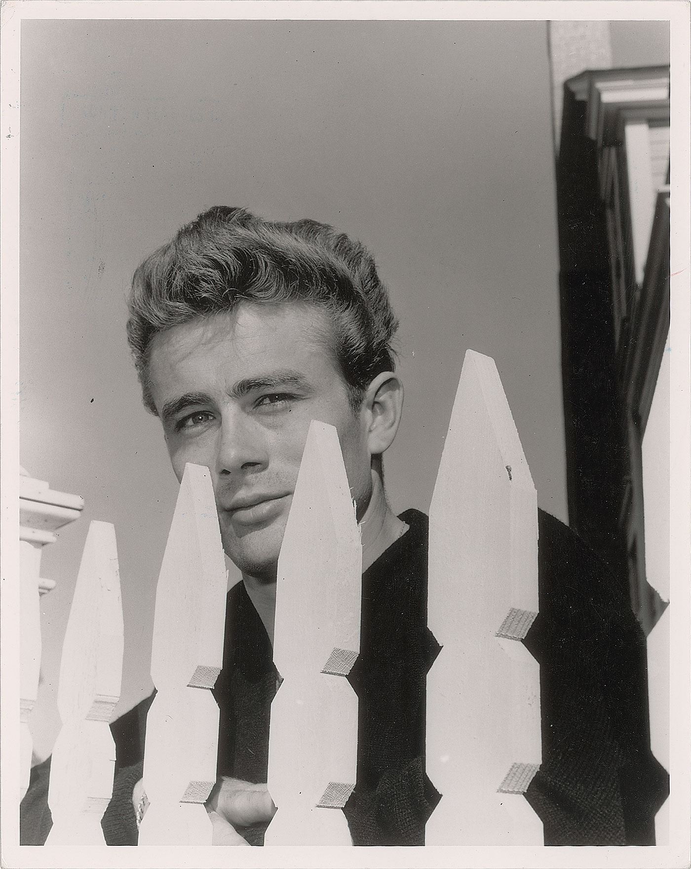 Original glossy 8 x 10 silver gelatin photo of James Dean peering over a white picket fence, printed from the original negative circa 1970s–80s. Reverse bears a London Features International credit stamp. In fine condition. From the Globe Photo archives.