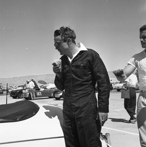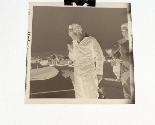 Great news for James Dean fans and collectors. From the personal collection of Gus V. Vignolle, well known journalist, photographer and publisher of "MotoRacing", one of the first and most influential car racing newspapers of the 1950’s. This is one in a limited series of negatives that have been missing for over 50 years until recently re-discovered by Vignolle’s daughter, Zaz Clark. These intimate photos are of James Dean in and around his Speedster 23F Porsche (License Plate #2U73378) that he bought at Competition Motors in Hollywood. They were taken during his infamous car race in Palm Springs, California in March of 1955 which was his first official race, and which he won not long before his accident in September of that year in his new Porsche Spyder 550 while on his way to a race in Salinas, California. These photographs only appeared once in the January 13th 1956 (Vol 1, No. 7) exclusive, fully-illustrated memorial issue of MotoRacing. This is the one and only original Black and White negative photographed and developed by Vignolle on Kodak Safety Film, taken at the race. It shows a candid moment of James Dean, snow cone in hand (Dean was "addicted" to popsicles and snow cones), admiring his newly bought 23F Speedster before his first race. His friend and mechanic Bill Tunstall is seen to his right. Racing photos of Dean are extremely rare, especially since he was only involved in a handful of races before his tragic accident. The negative comes with a COA, plus full copyright release for unlimited reproduction printing to the winning bidder. The Negative is carefully packed in a wax envelope, and includes a positive proof photo. Also Includes a copy of the MotoRacing issue. (Negative approx. 2 3/8" x 2 3/8" & photo approx. 5" x 4").