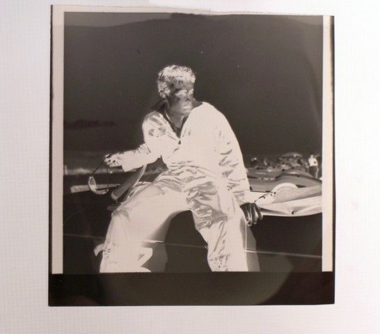 A rare find for James Dean collectors. From the personal collection of Gus V. Vignolle, well known journalist, photographer and publisher of "MotoRacing", which was one of the first and most influential racing newspapers of the 1950’s. This is one in a series of negatives that have been missing for over 50 years until recently re-discovered by Vignolle’s daughter, Zaz Clark. These amazingly intimate photos are of James Dean in and around his Speedster 23F Porsche (License Plate #2U73378) that he bought at Competition Motors in Hollywood. They were taken during his infamous car race in Palm Springs, California in March of 1955 which was his first official race, and which he won not long before his accident in September of that year in his new Porsche Spyder 550 while on his way to a race in Salinas, California. These photographs only appeared once in the January 13th 1956 (Vol 1, No. 7) exclusive, fully-illustrated memorial issue of MotoRacing. This is a Black and White inter-negative made by Vignolle on Kodak Safety Film, from a color negative taken at the race. All the color negatives from this race have been lost, making this the only existing negative. It shows James Dean sitting on the driver's door of his Speedster 23F, in his racing jumpsuit, swinging his racing goggles in his right hand. It comes with a COA, plus full copyright release for unlimited reproduction printing to the winning bidder. The Negative is carefully packed in a wax envelope, and includes a positive proof photo struck from the negative. Also includes a copy of the MotoRacing issue. (Negative approx. 2 3/8" x 2 3/8" & photo approx. 5" x 4").