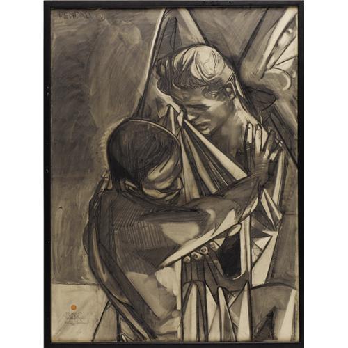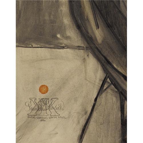 <B>Kenneth Kendall "Jacob Wrestles the Angel" James Dean Drawing.</B></I> A large charcoal sketch drawn by Kendall in 1956, titled <I>Jacob Wrestles the Angel</B></I> and depicting a winged James Dean wrestling Marlon Brando. In Excellent condition and framed to an overall size of 27" x 36". <I>From the James Dean Museum archive.</B></I>