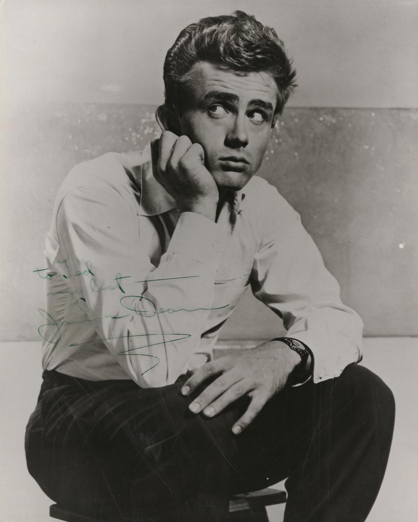 James Dean signed photo of himself as character Jim Stark from ''Rebel Without a Cause.'' Inscribed and signed on the image in ink, “to Ted my best – James Dean”. 8'' x 10'' gelatin silver semi-gloss double-weight portrait taken by photographer Jack Albin; with photographer and Warner Bros. studio rubber stamp on verso. Due to Dean’s very short career, cut short by his untimely death, his autograph material is quite scarce. Exhibits minor scuffing, otherwise fine condition.