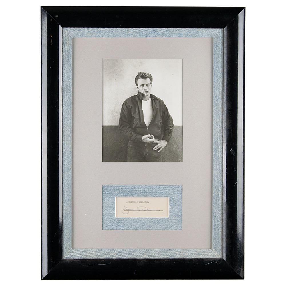 Ultra-desirable vintage fountain pen signature, "James Dean,†on an off-white 4.75 x 1.75 slip. Handsomely double-matted and framed with a portrait to an overall size of 17.75 x 23.75. In fine condition. A great display evoking the denim-clad star's iconic style.